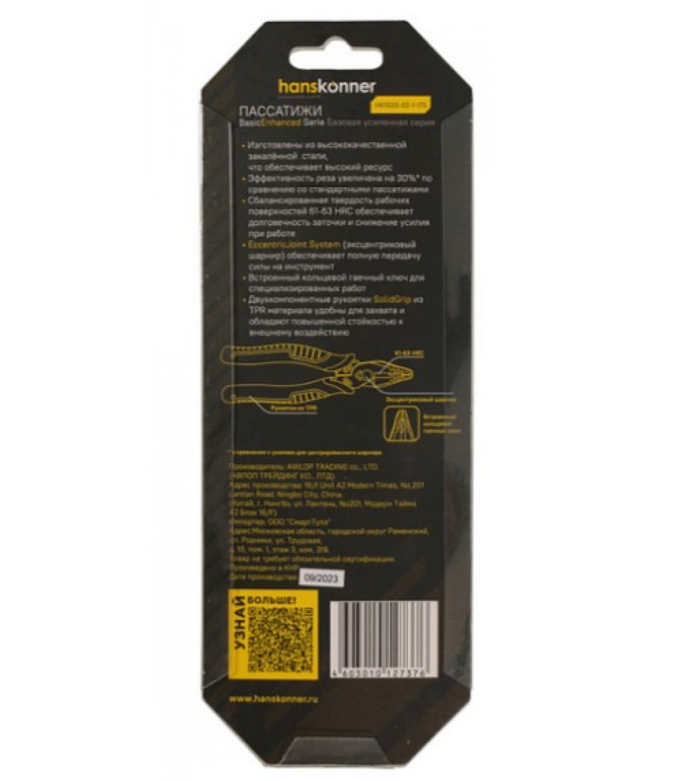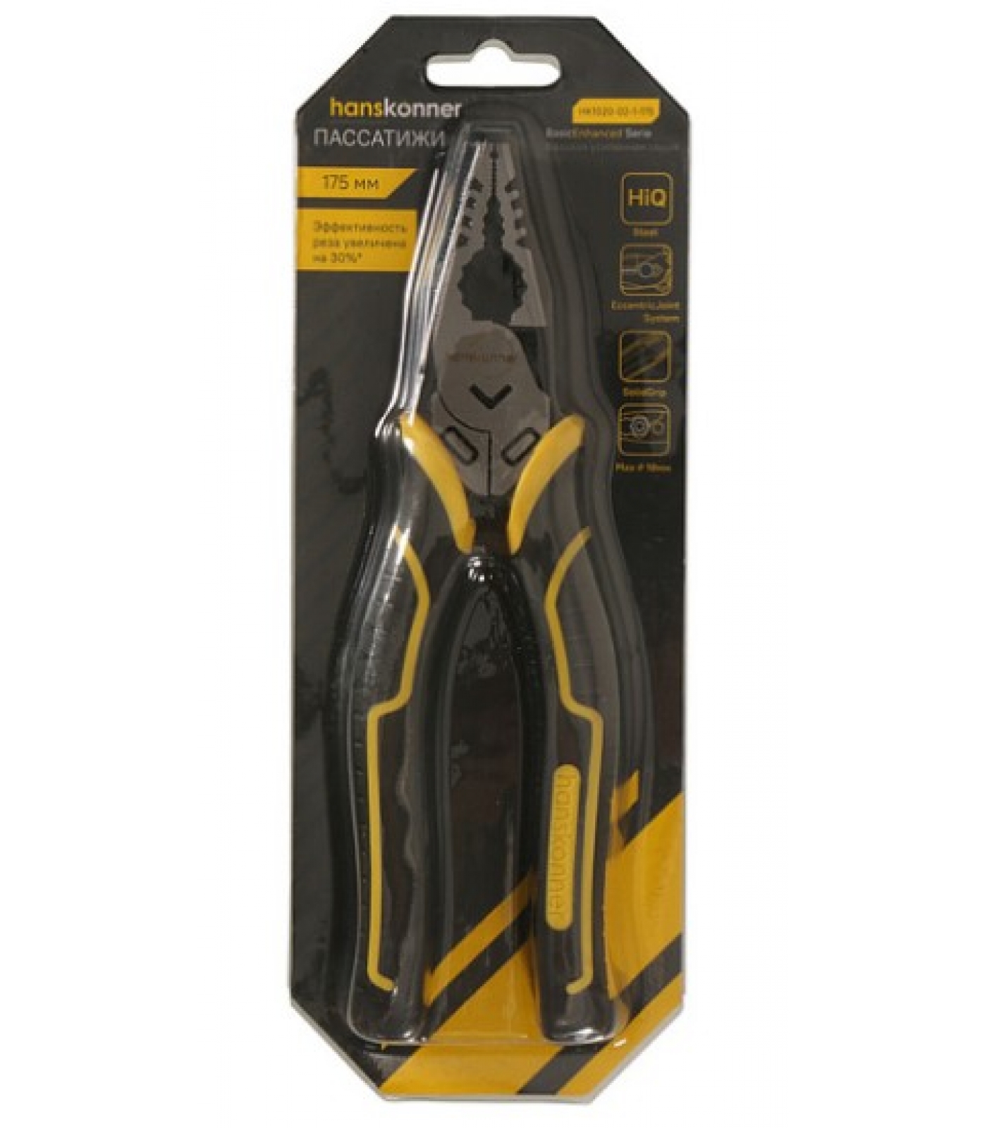 Hanskonner HK1020-02-1-175 Пассатижи 175мм, эксцентриковый шарнир, +30% к силе реза, СrV, TPR рукоятки