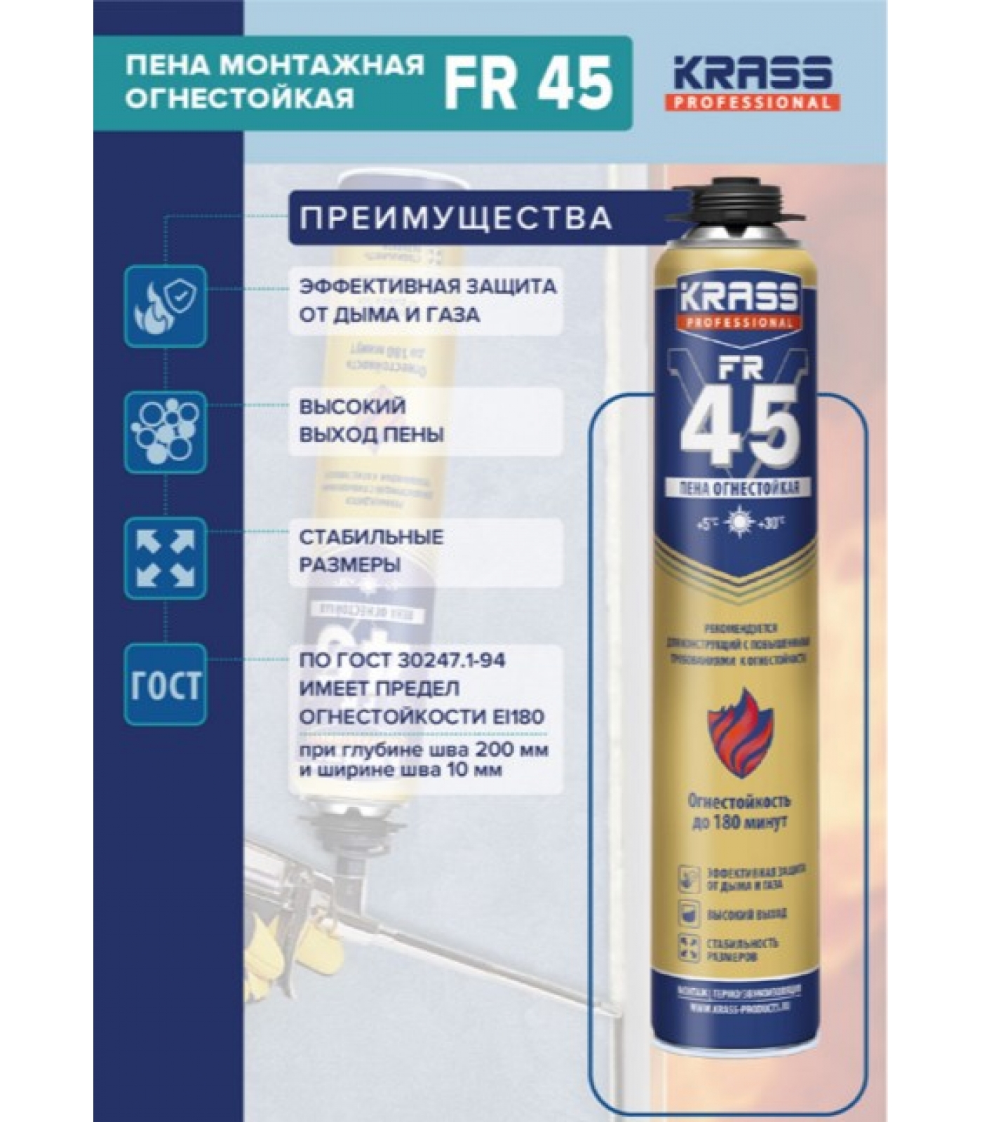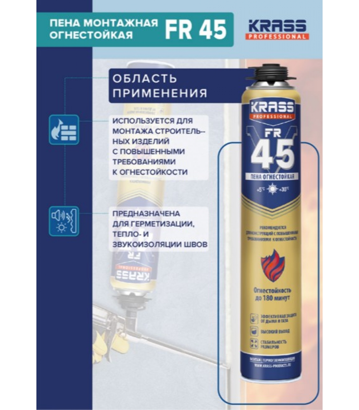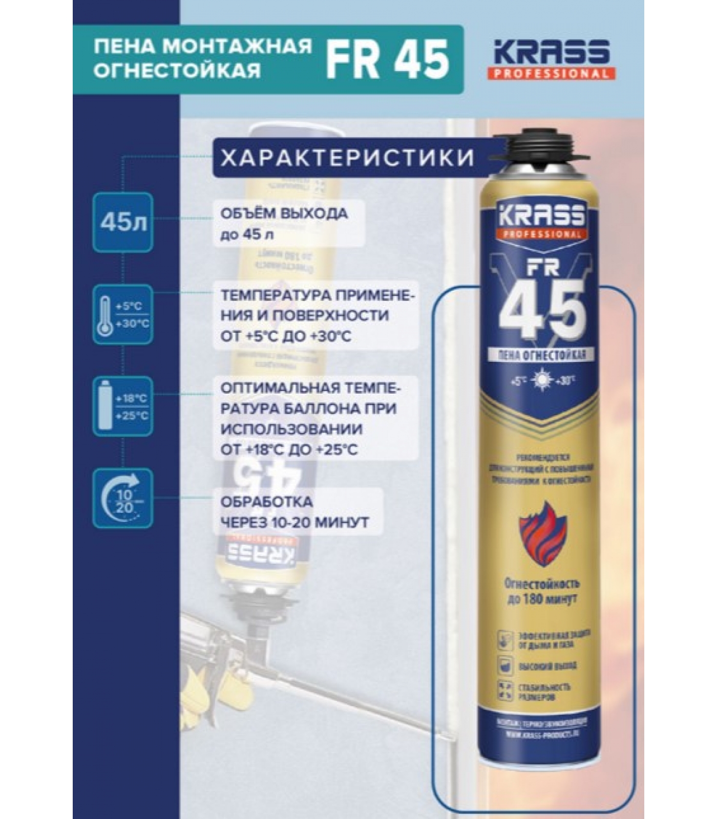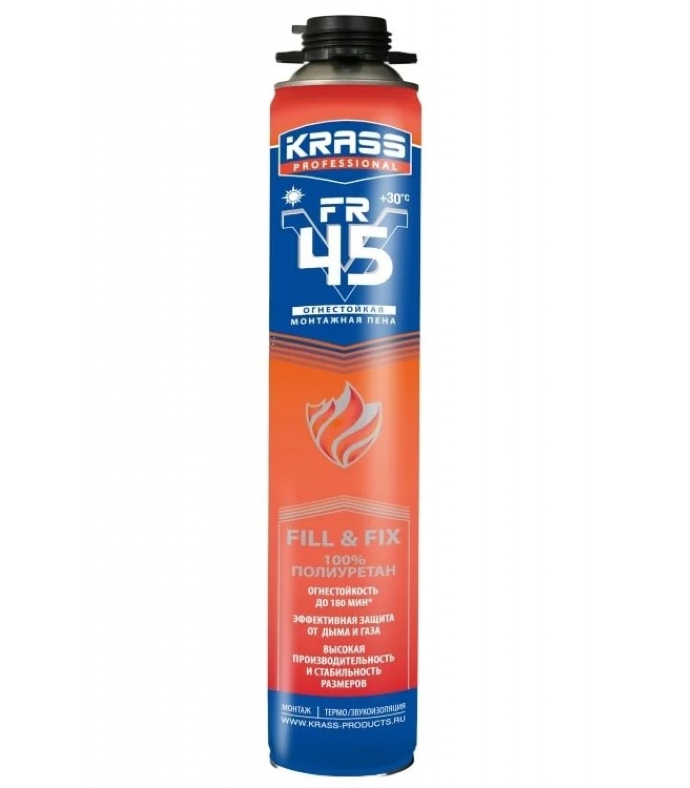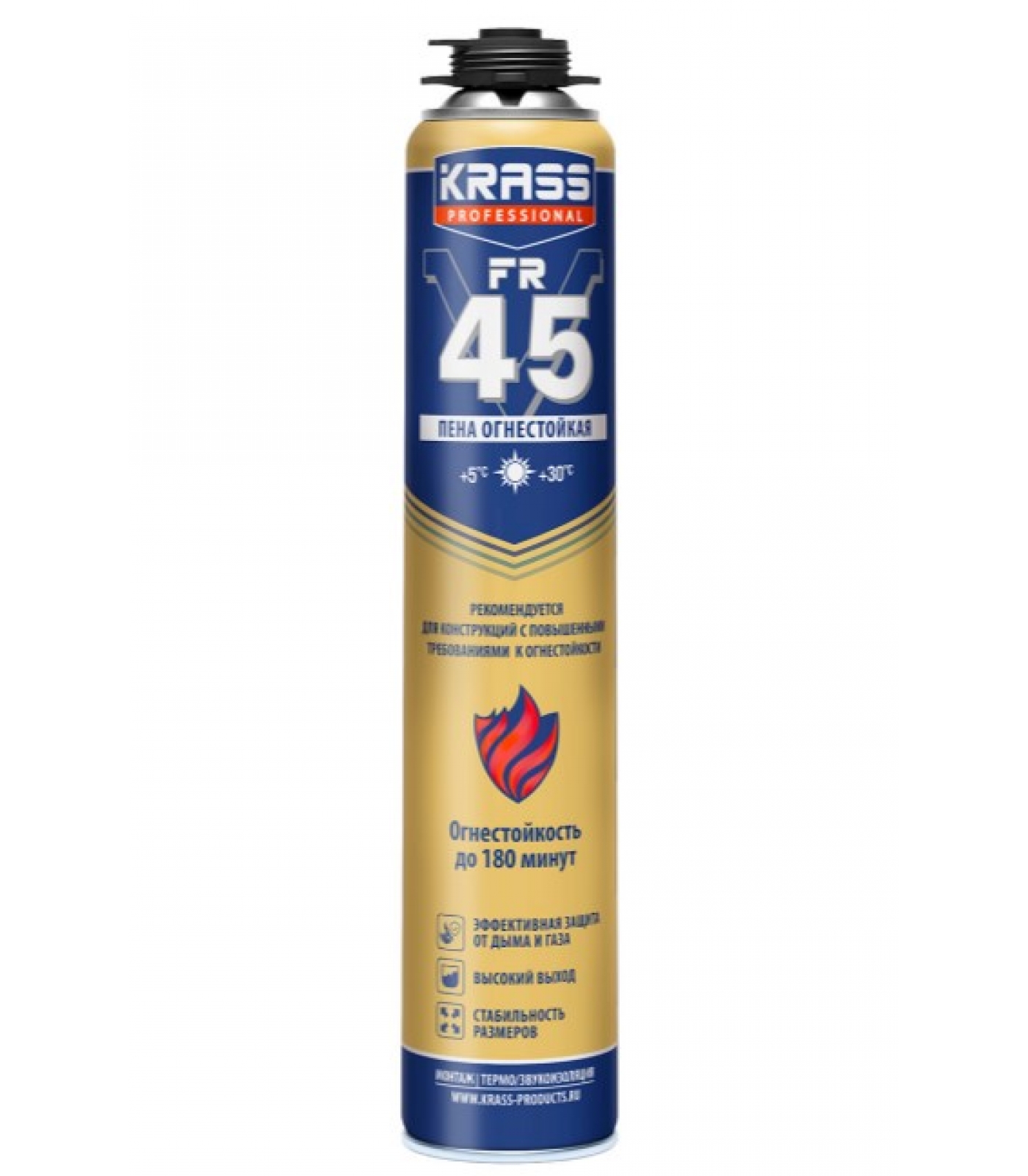 Пена монтажная Krass Professional FR V45 огнестойкая, пистолетная, до 45л, 750мл