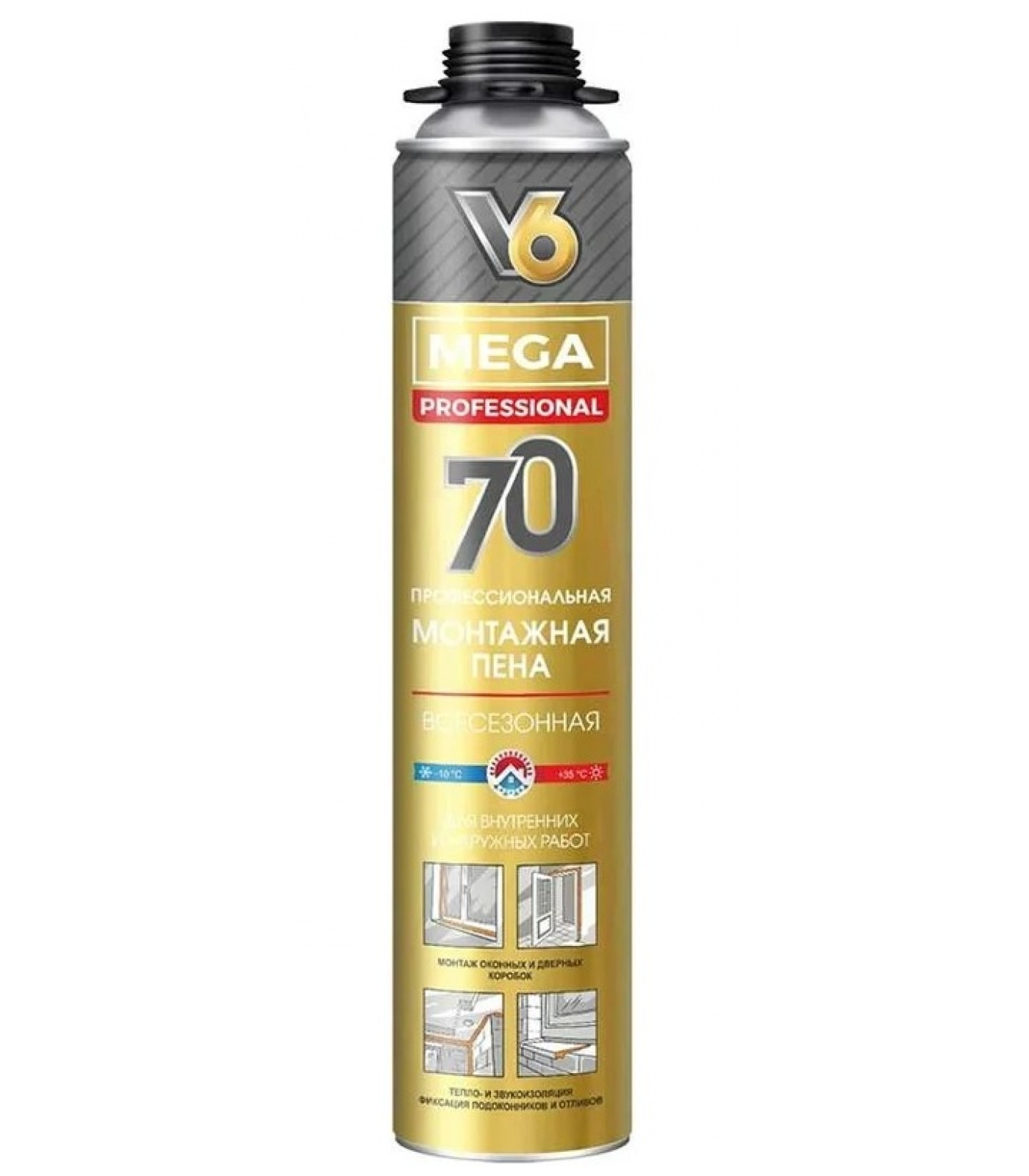 Пена V6 MEGA 70 профессиональная всесезонная - это однокомпонентная, готовая к применению, полиуретановая пена в аэрозольной упаковке. В качестве газа-вытеснителя применяется углеводородный пропеллент. Затвердевает под действием влаги воздуха и влаги поверхности, на которую наносится. Затвердевшая пена относится к классу полужестких пен.