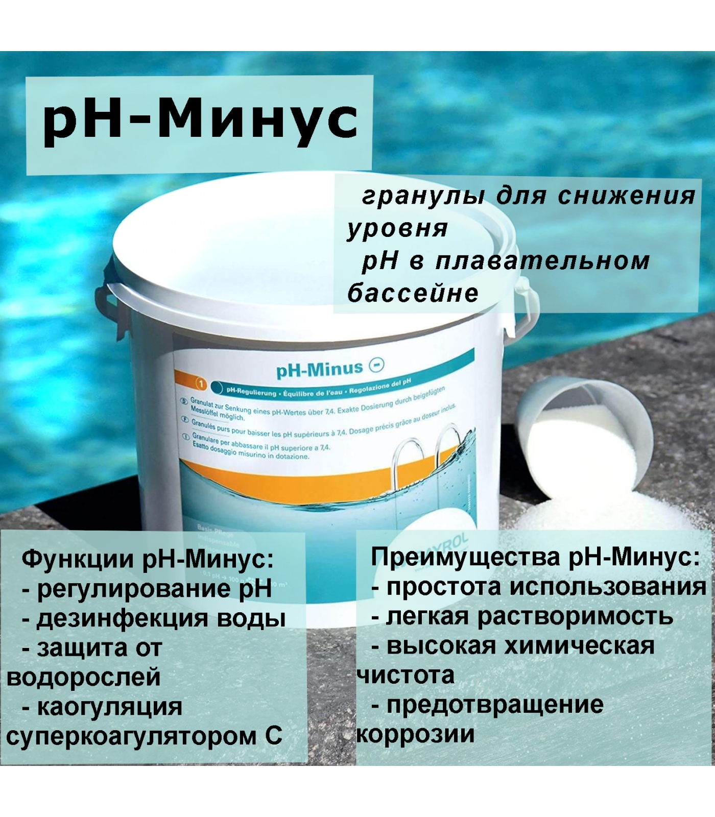 pH-Минус - гранулы для снижения уровня pH в плавательном бассейне. Средство легко растворяется в воде.