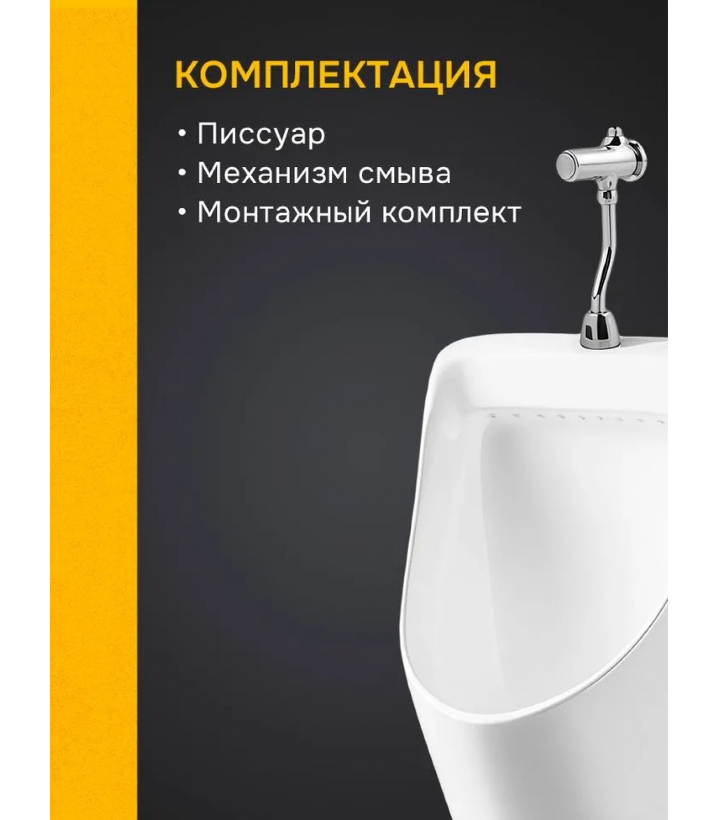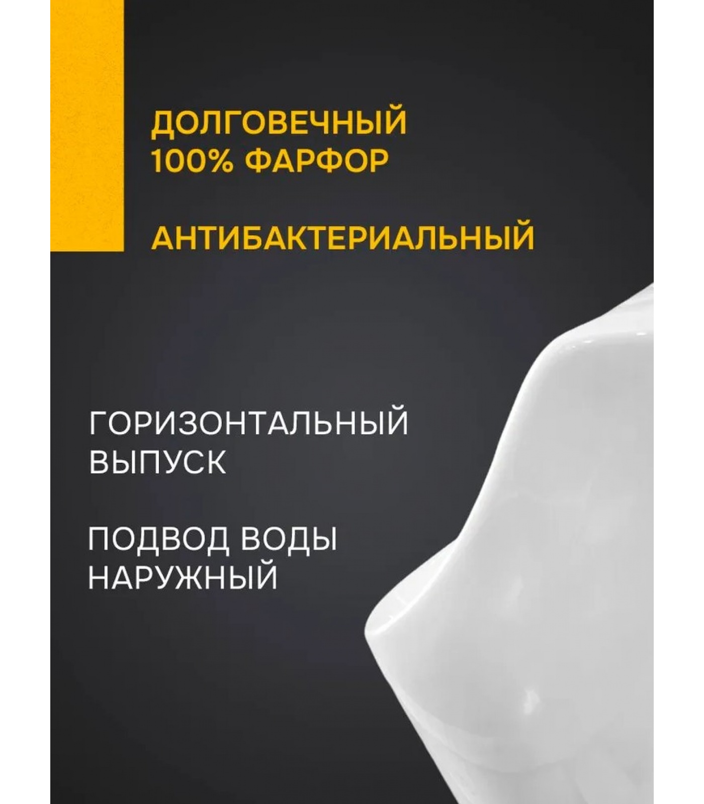 Эргономичный дизайн: Писсуар имеет гладкие линии и современный стиль, который легко впишется в любой интерьер. Он изготовлен из высококачественного санитарного фарфора, устойчивого к повреждениям и легкого в уходе.