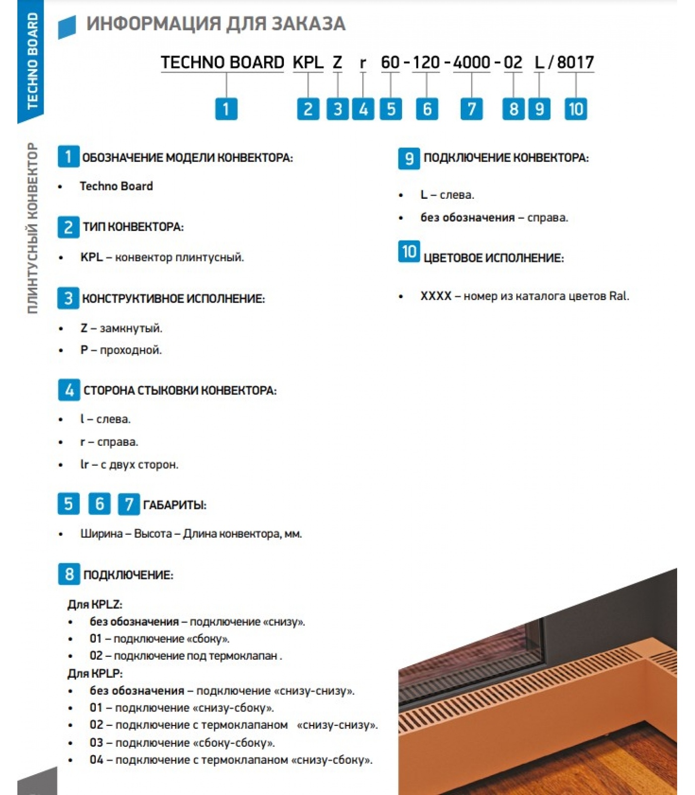Плинтусный конвектор Techno Board KPLZ 60-120-2000-00 коричневый, подключение нижнее правое