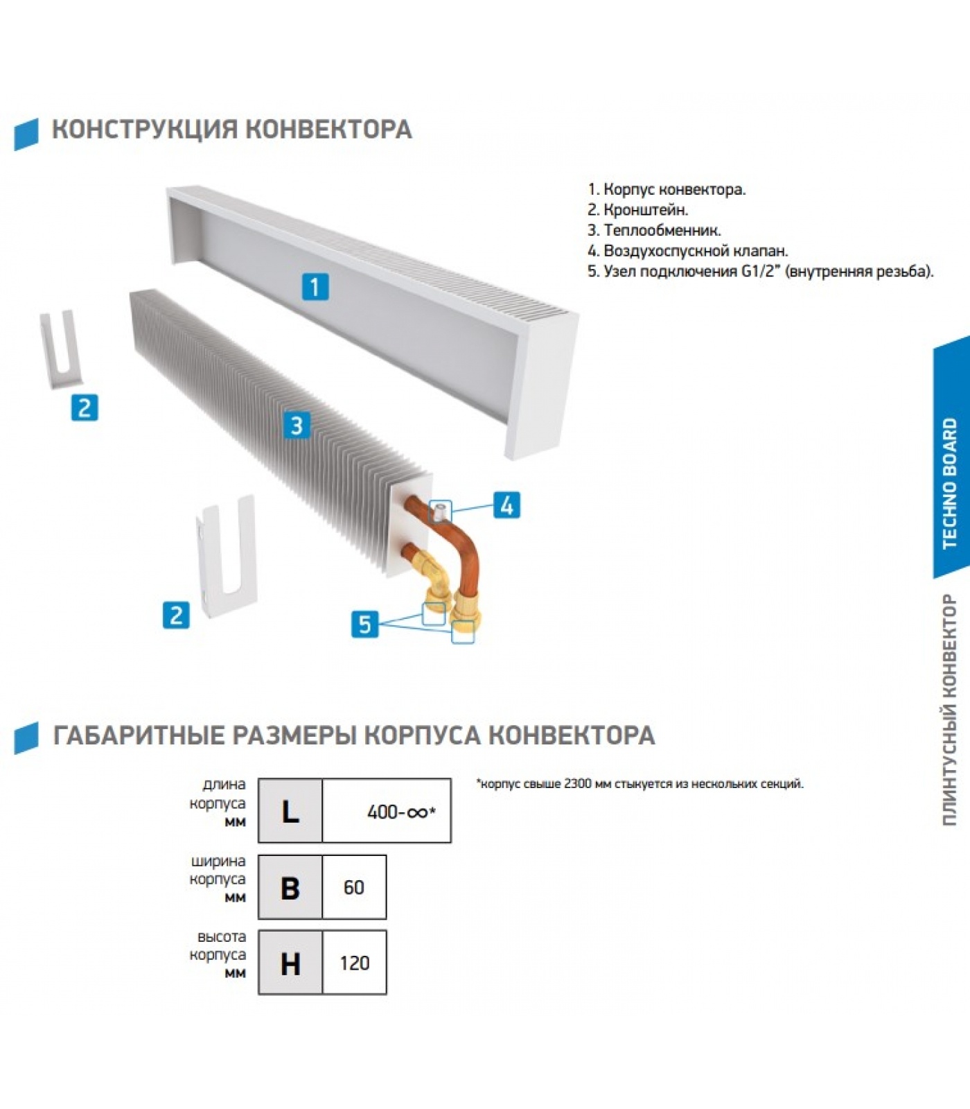 Techno Board– компактный незаметный отопительный прибор с естественной конвекцией. Быстро и равномерно распределяет теплый воздух в помещении. Конвектор легко монтируется на стене вдоль пола вместо обычного плинтуса. За счет создания "теплового экрана" снижает теплопотери через стены и остеклённые поверхности, защищает стены от сырости, промерзания и плесени. Исключает необходимость разводки труб отопления. Теплый плинтус подходит для отопления любых объектов.