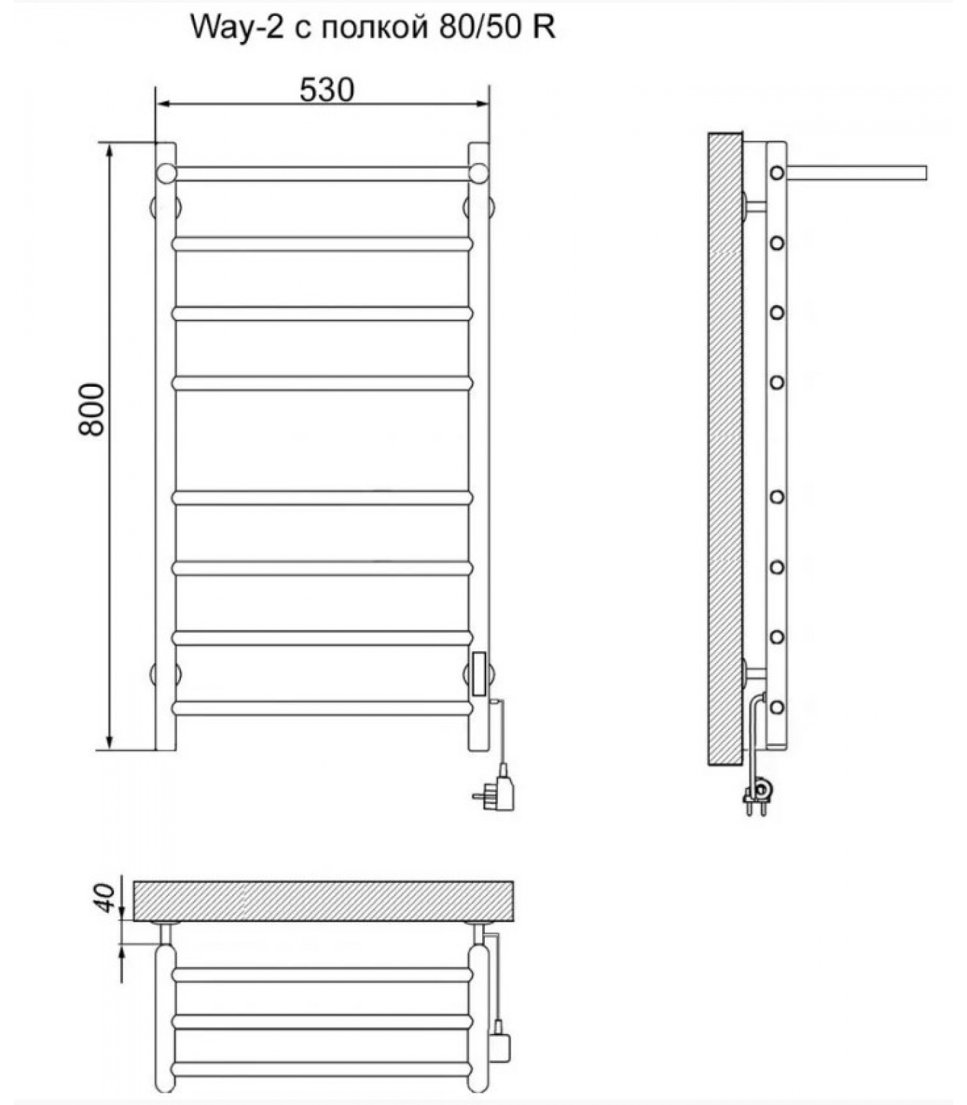 Полотенцесушитель 80/50 Ника WAY 2 электрический с полкой, хром, правый тэн, с греющим кабелем
