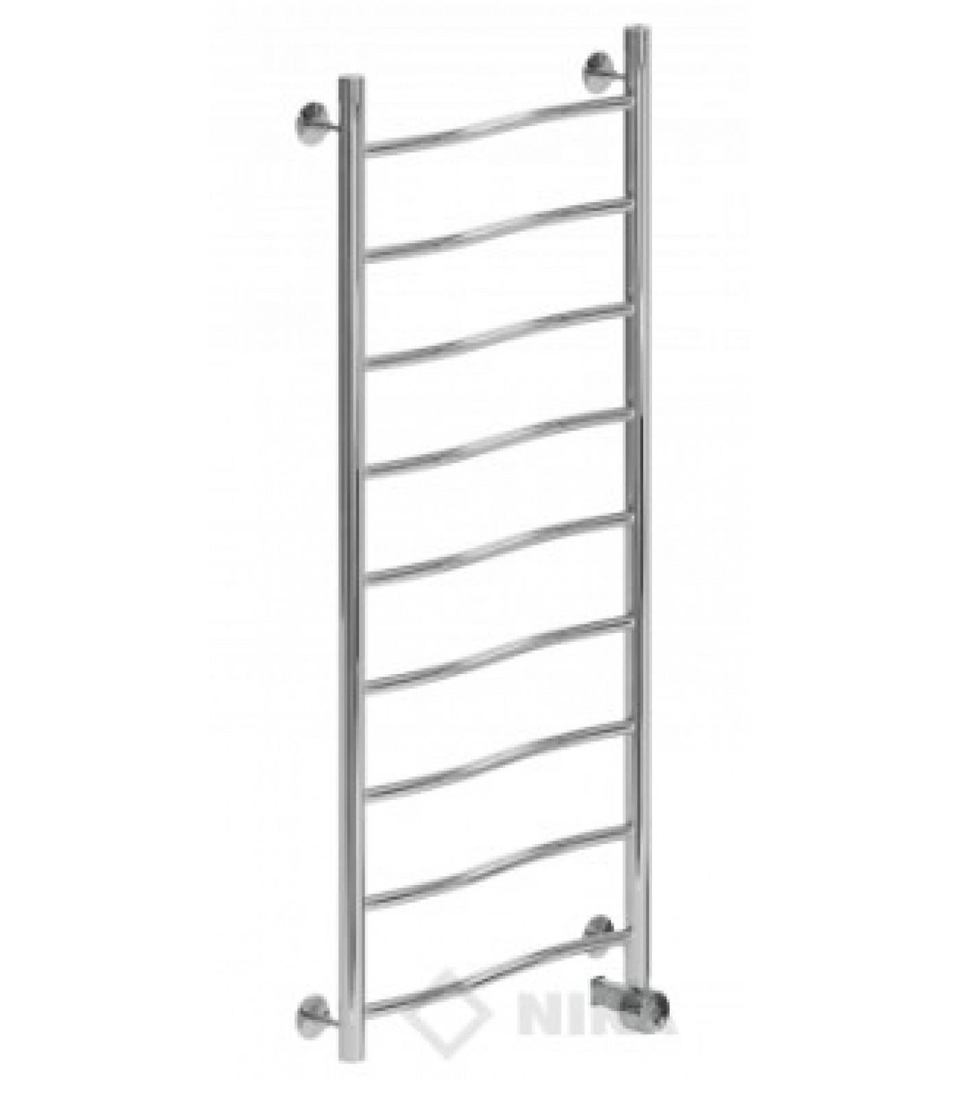 Строгая, прямоугольная форма, хромированное покрытие, вертикальные стойки и необычные, горизонтальные перемычки волнообразной формы.