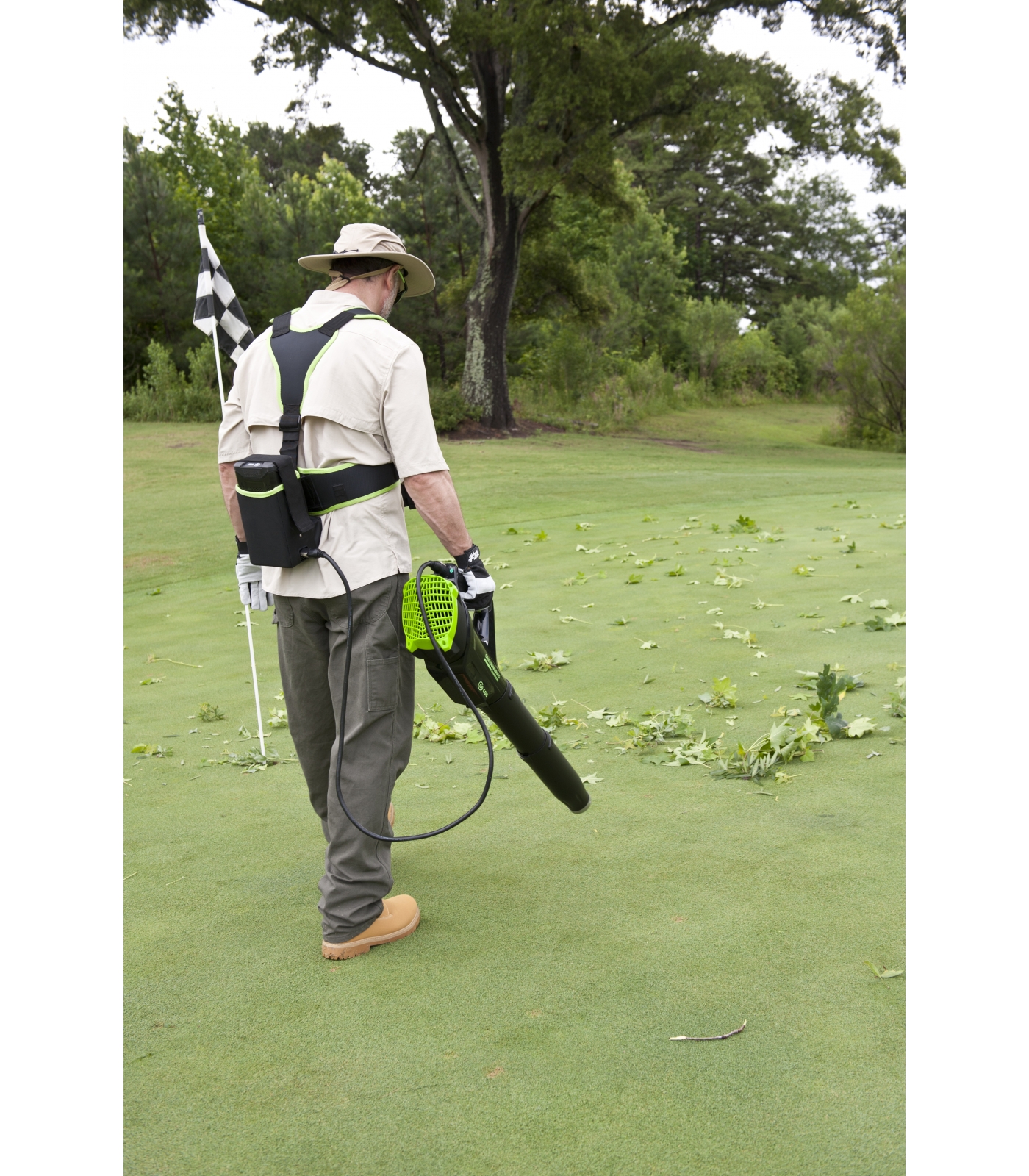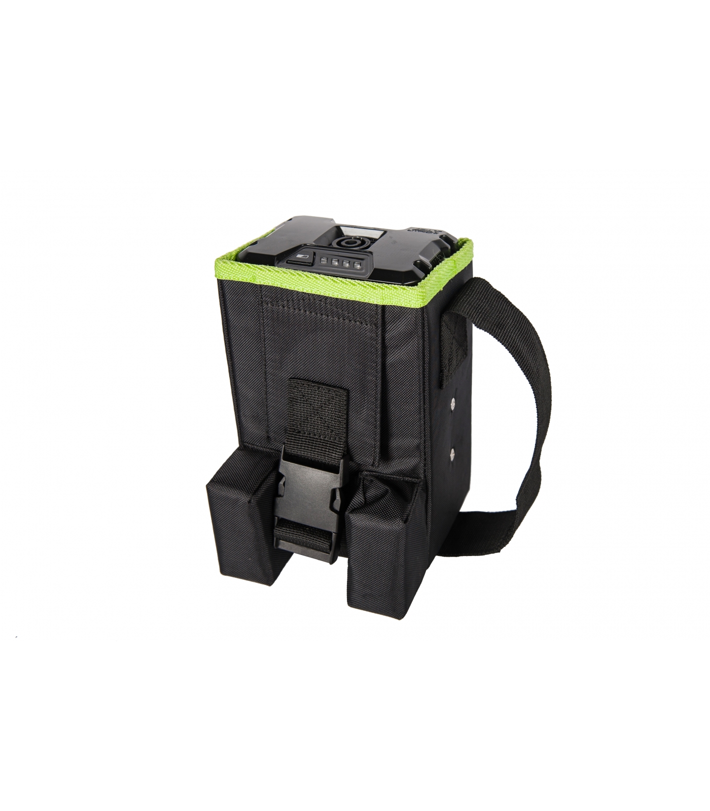 Поясной держатель с переходником для зарядки аккумуляторов Greenworks Арт. 2916107, 82V. Позволяет разместить аккумулятор на поясном ремне (или лямках Арт. 2916207), снизив тем самым нагрузку на руки оператора.