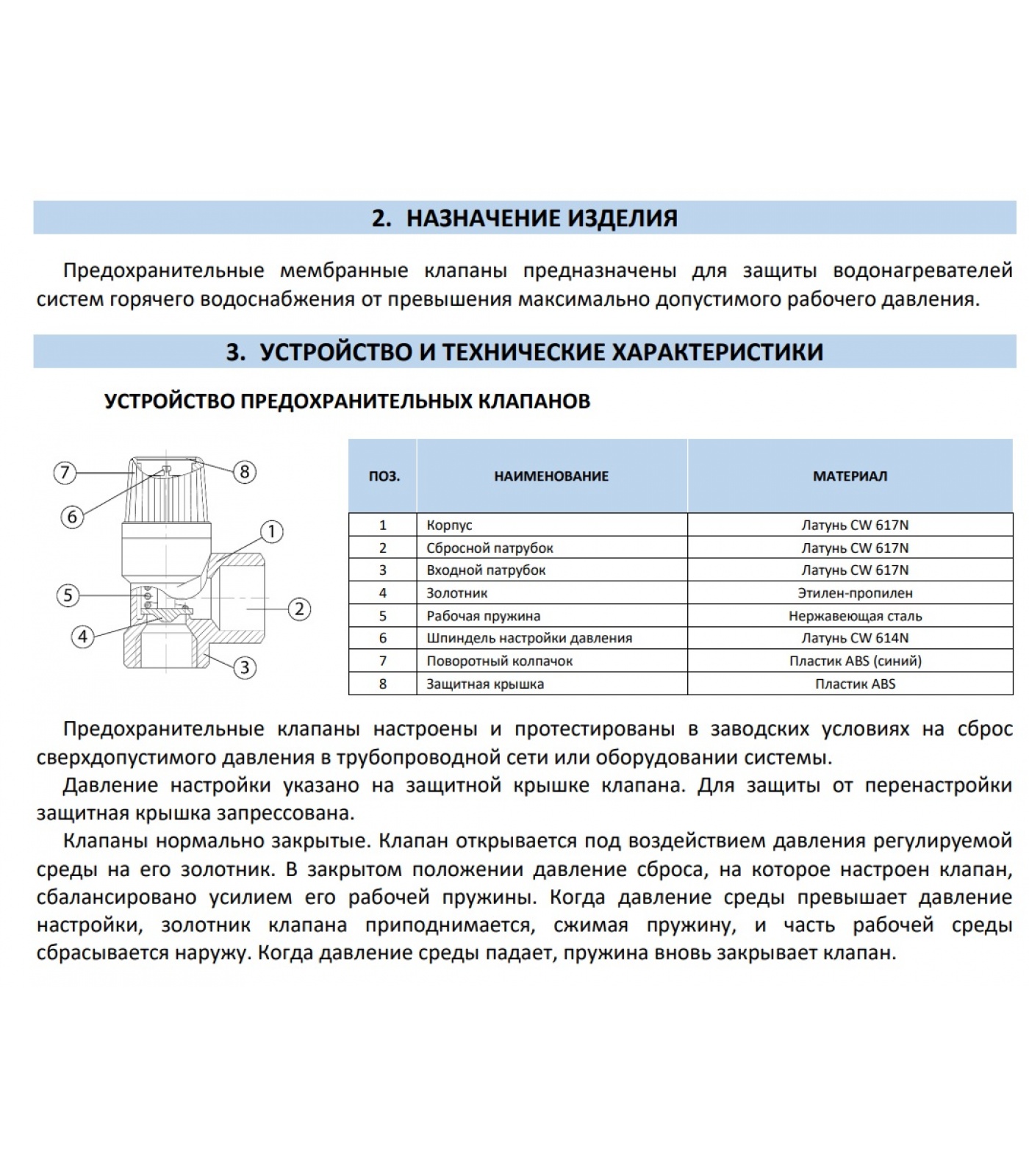 Предохранительные мембранные клапаны предназначены для защиты водонагревателей систем горячего водоснабжения от превышения максимально допустимого рабочего давления.