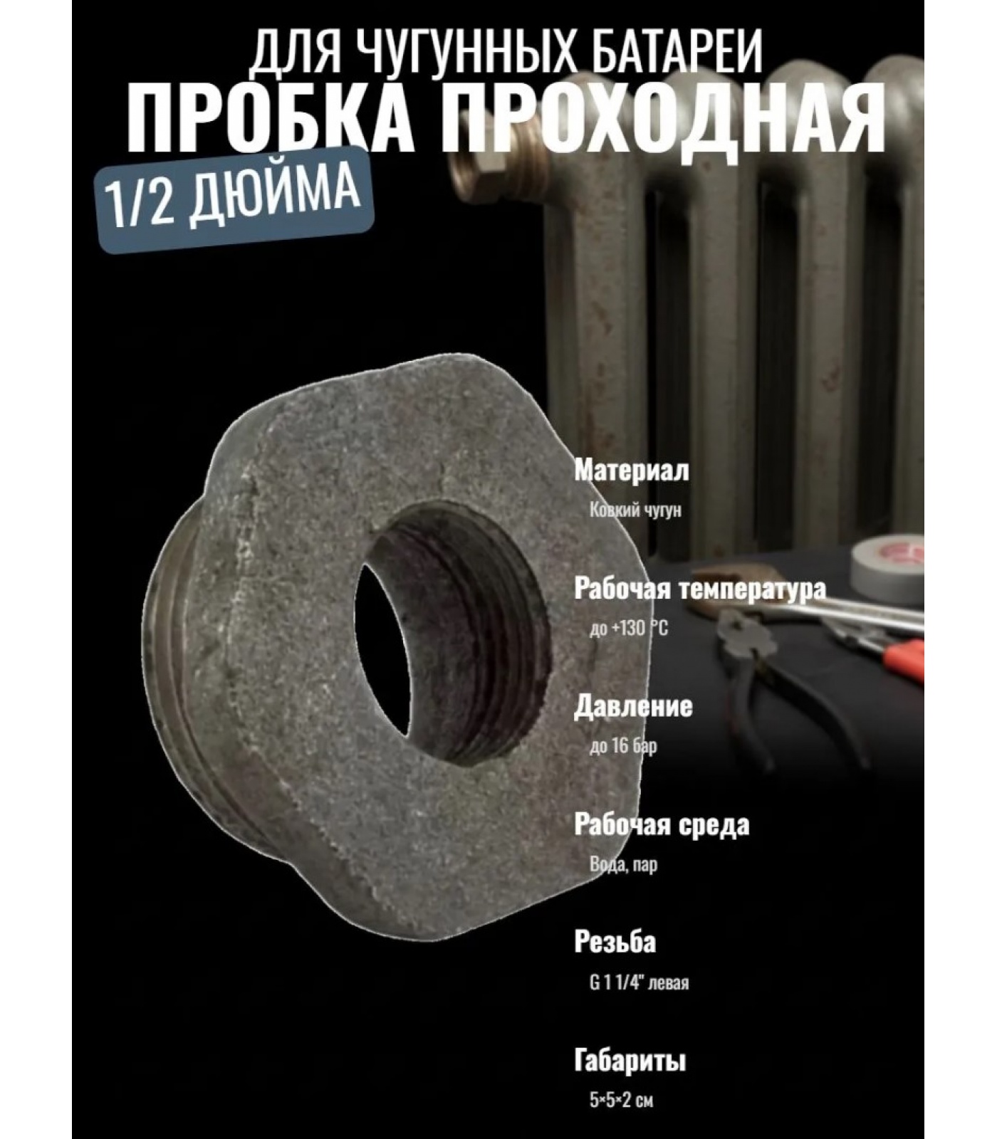 Пробка для чугунного радиатора проходная левая 1 1/4" х 1/2"