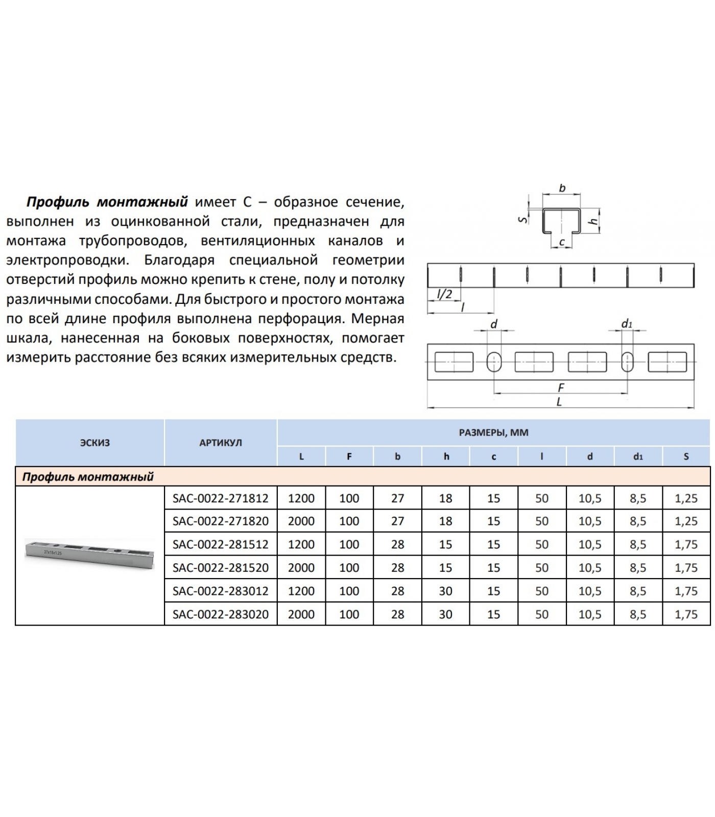 Профиль монтажный имеет С – образное сечение, выполнен из оцинкованной стали, предназначен для монтажа трубопроводов, вентиляционных каналов и электропроводки. Благодаря специальной геометрии отверстий профиль можно крепить к стене, полу и потолку различными способами. Для быстрого и простого монтажа по всей длине профиля выполнена перфорация. Мерная шкала, нанесенная на боковых поверхностях, помогает измерить расстояние без всяких измерительных средств.