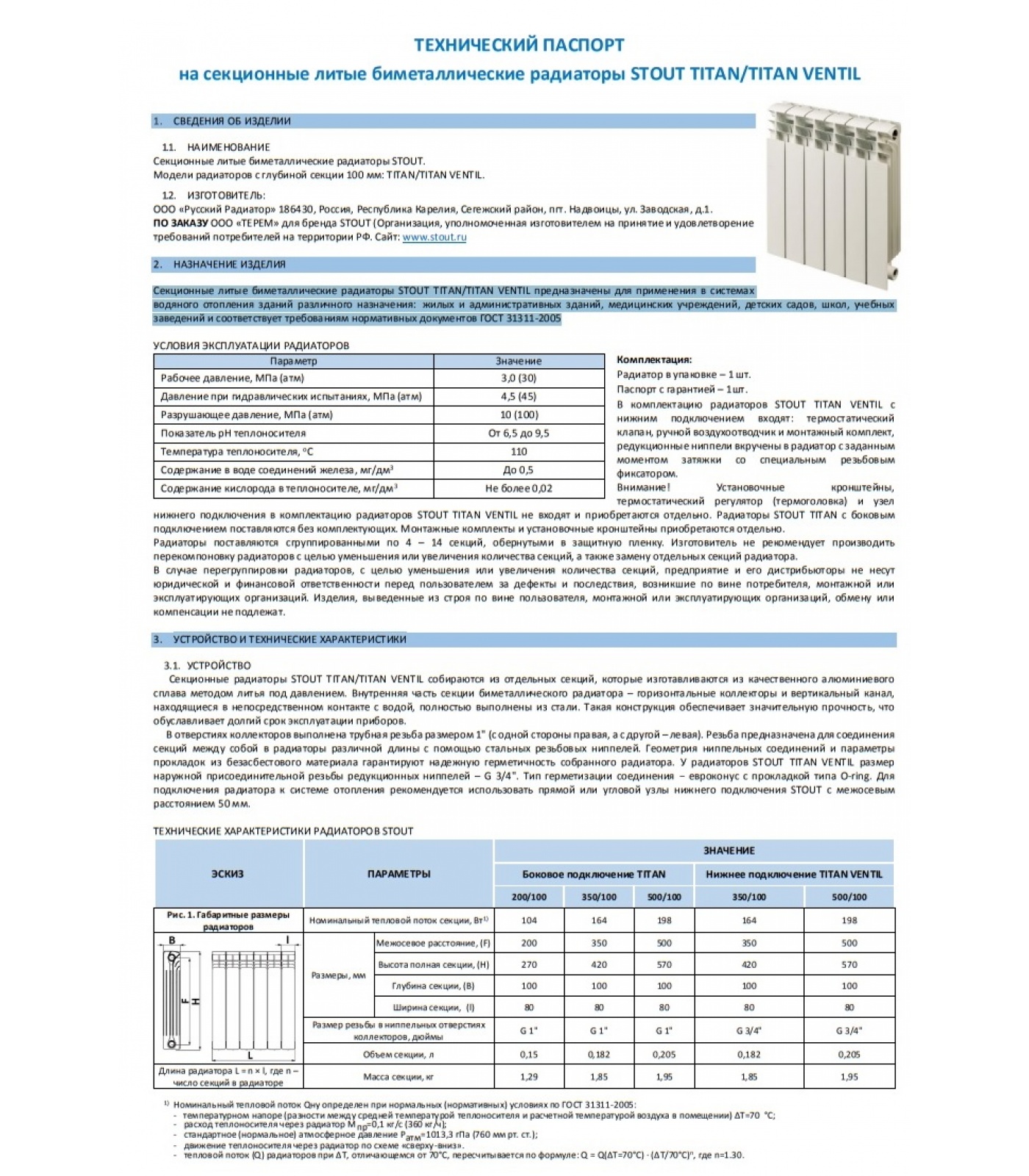 Секционные литые биметаллические радиаторы STOUT TITAN/TITAN VENTIL предназначены для применения в системах водяного отопления зданий различного назначения: жилых и административных зданий, медицинских учреждений, детских садов, школ, учебных заведений и соответствует требованиям нормативных документов ГОСТ 31311-2005.