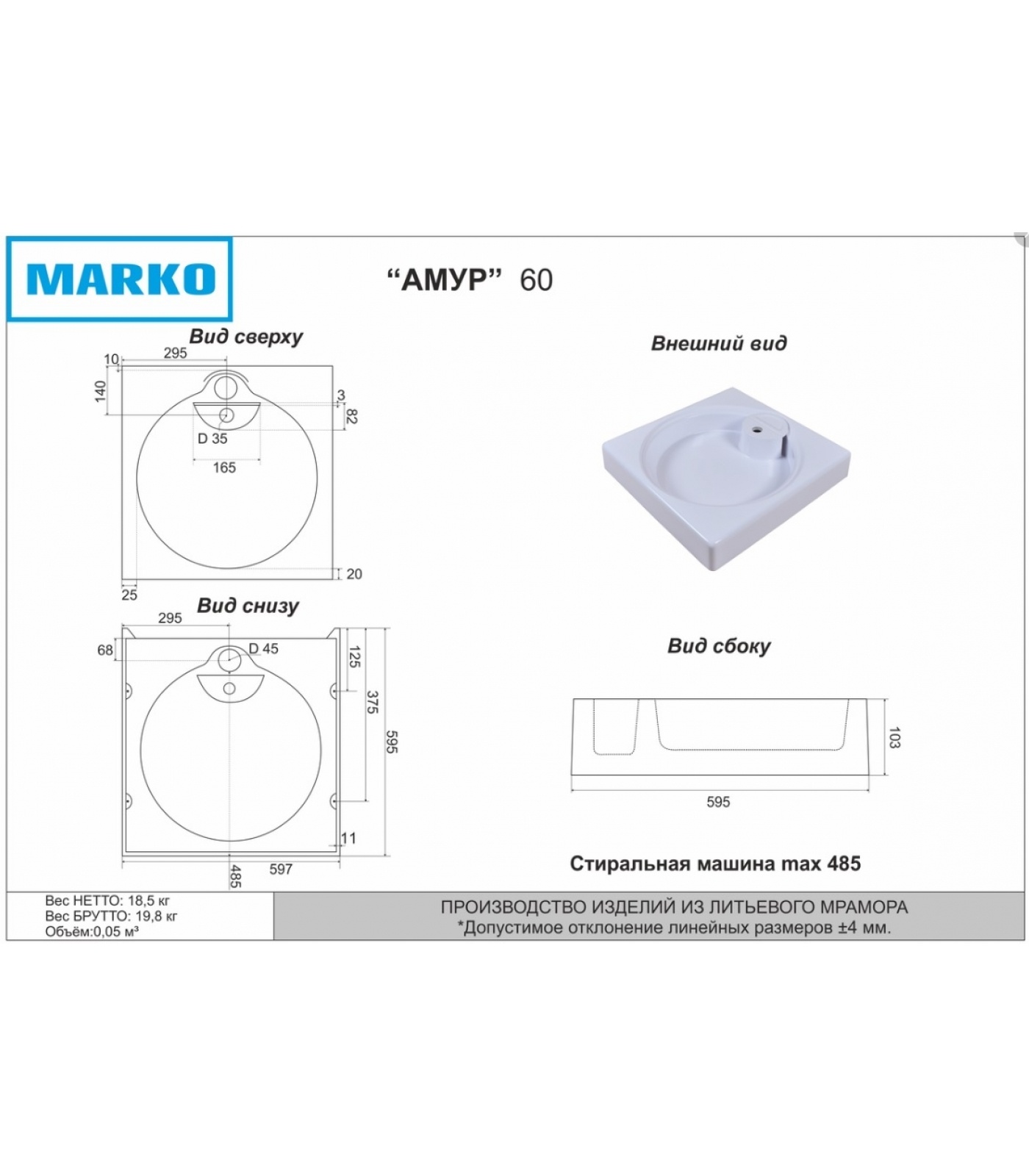 Раковина Марко Амур 600х600, подвесная над стиральной машиной