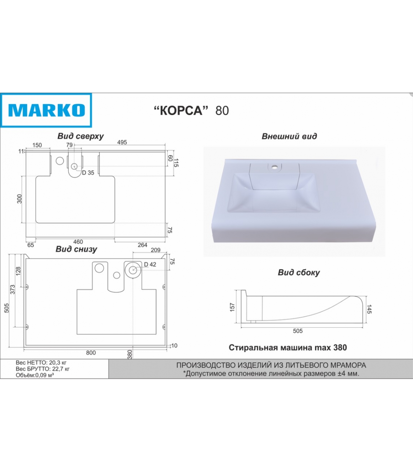 Раковина Марко Корса 800х500, подвесная с установкой над стиральной машиной сэкономит место в ванной комнате и стильно подчеркнет современный дизайн. Дополнительное место на крыле раковины справа удобно разместит различные мелочи и принадлежности, а под крылом возможна установка небольшой тумбы.