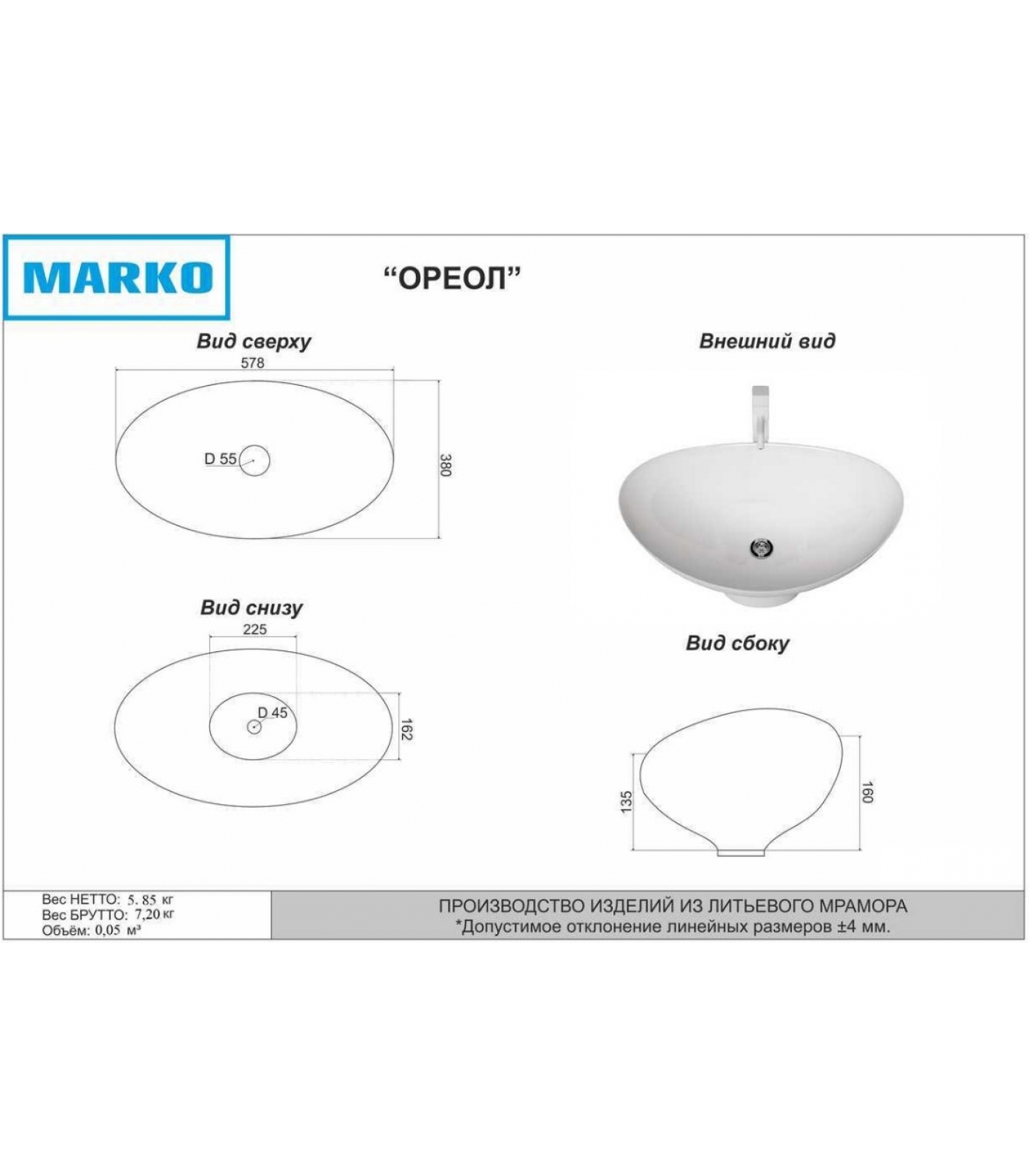 Раковина накладная Marko Ореол 59 в форме изящной овальной чаши. Выполнена из литьевого мрамора c гелькоутным покрытием, плотная структура которого устойчива к загрязнениям, не впитывает красящие средства, исключает образование плесени и грибка. Сохраняет эстетичный вид и чистоту на долгие годы. Изделие имеет приятную теплую поверхность, ударостойкое и устойчиво к негативным воздействиям, отличается безупречным стилем и идеальной геометрией. Раковина предназначена для установки на столешницу, тумбу-комод. Является отличным решением для оптимизации пространства в ванной комнате.