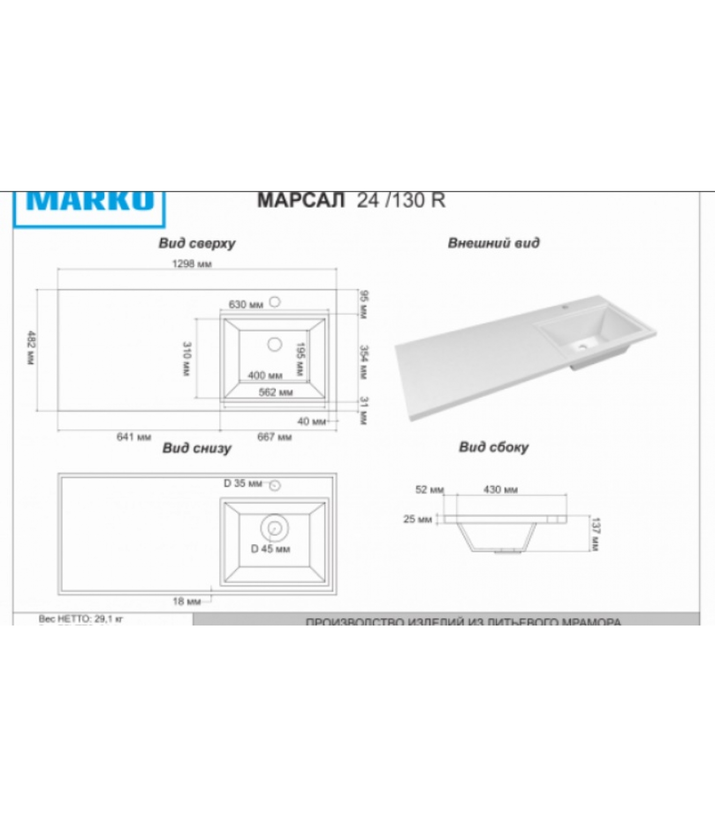 Раковина Марко Марсал - практичная прямоугольная модель с крылом и отверстием под смеситель, изготовлена из белоснежного, идеально гладкого литьевого мрамора c гелькоутным покрытием ViaPal, плотная структура которого исключает образование грибка и плесени.