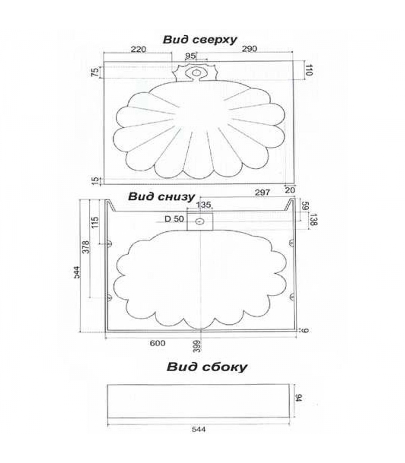 Д-600 мм. Ш-544 мм, Глубина чаши 94 мм