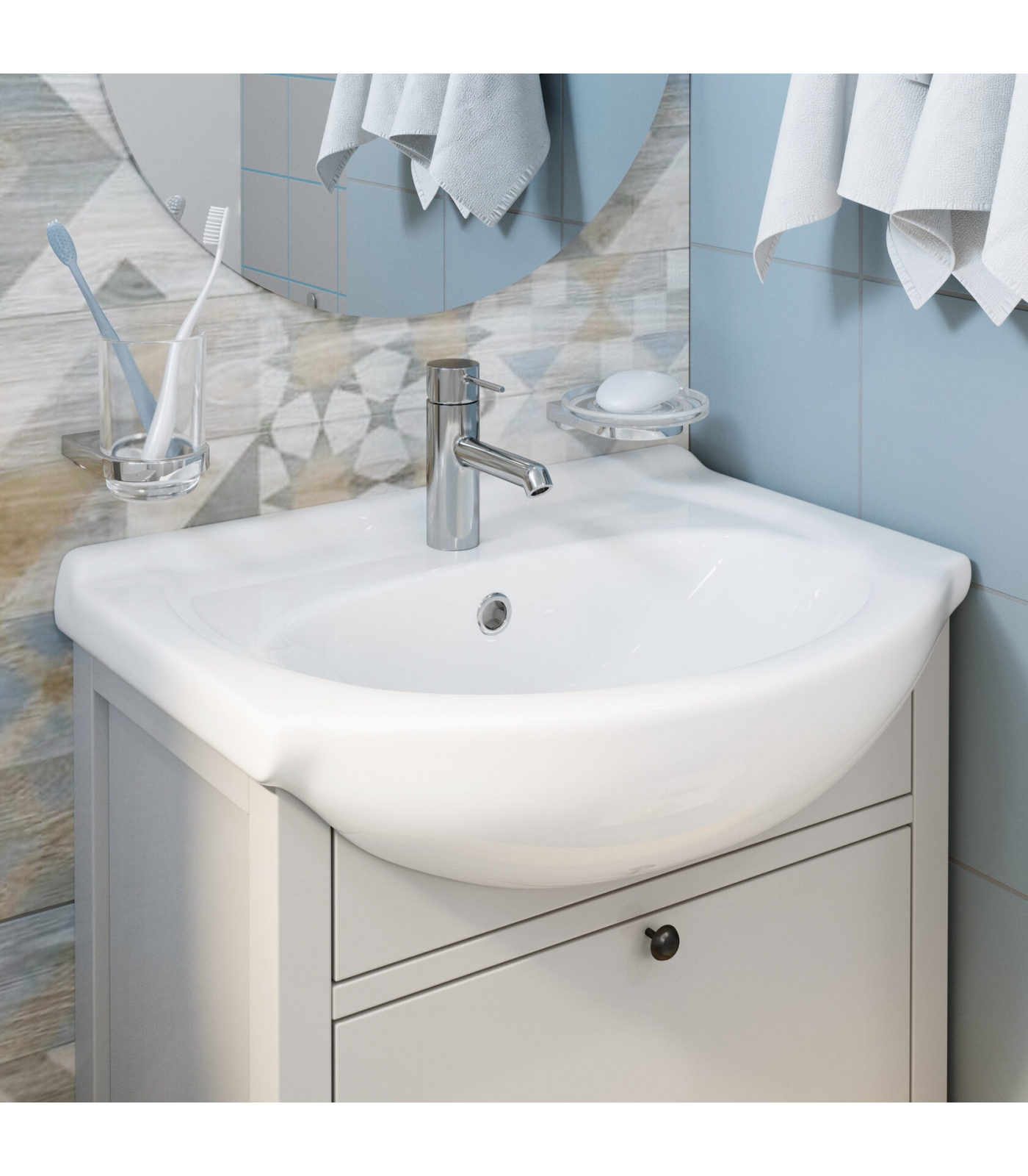 Аккуратный и свежий облик ванной комнаты обеспечен вам с мебельным умывальником «Вега 55». Тумба под умывальником скроет сантехнические узлы и бытовые мелочи, которые так захламляют интерьер. Белоснежный умывальник из качественного фарфора придаст помещению ощущение чистоты и свежести.