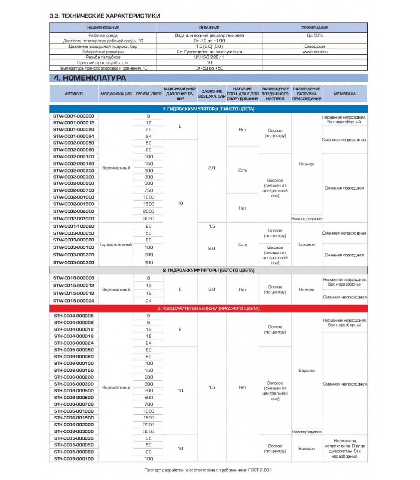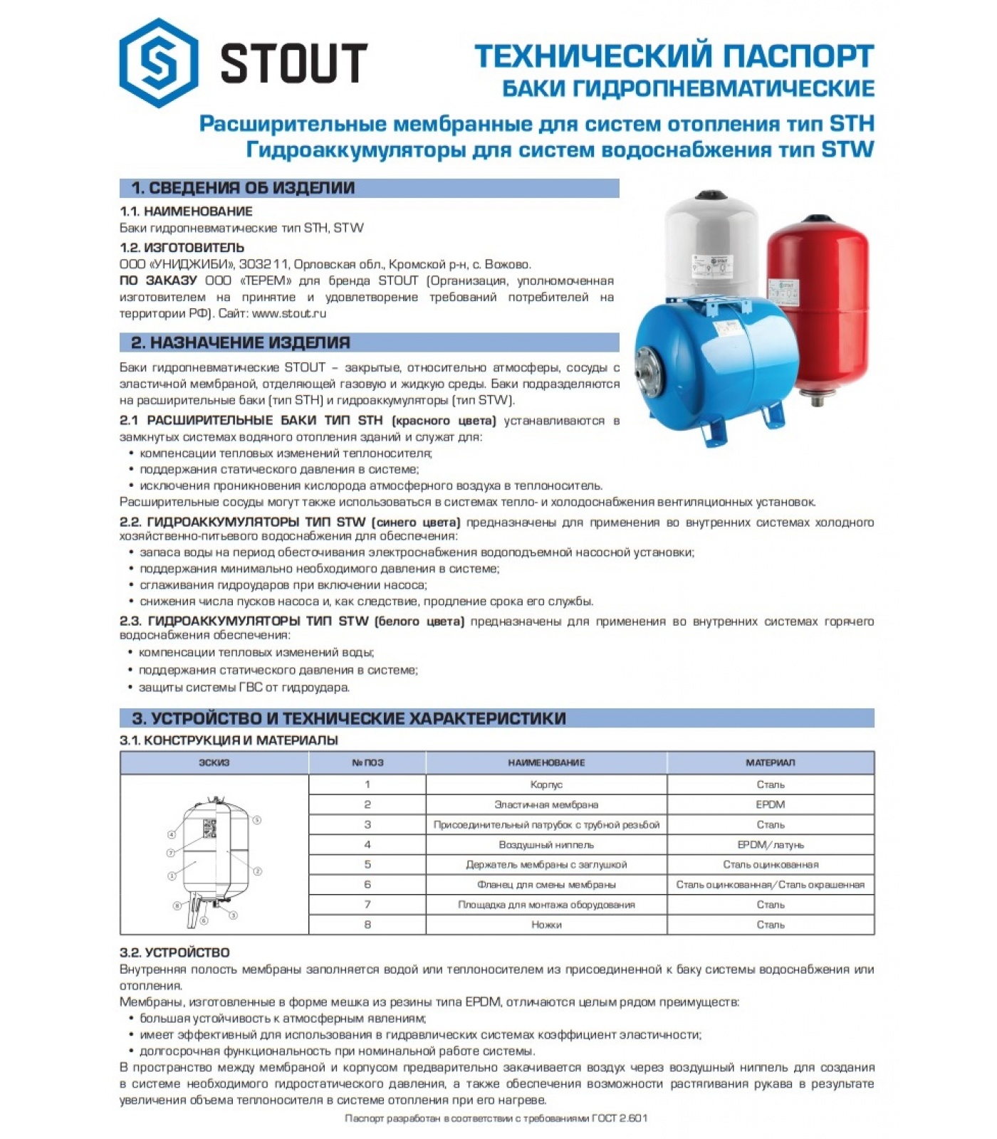 Баки гидропневматические STOUT – закрытые, относительно атмосферы, сосуды с эластичной мембраной, отделяющей газовую и жидкую среды. Баки подразделяются на расширительные баки (тип STН) и гидроаккумуляторы (тип STW).