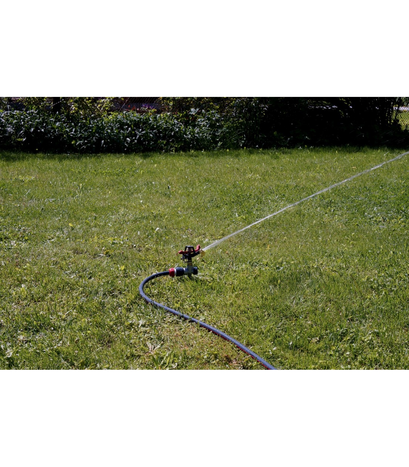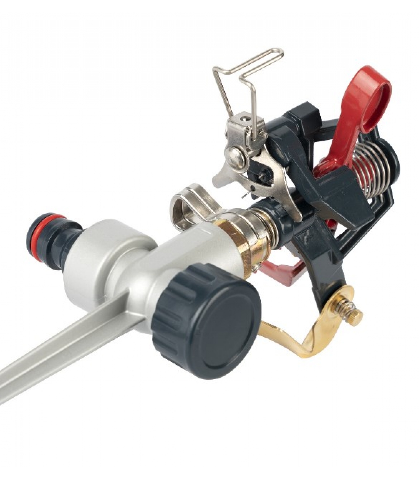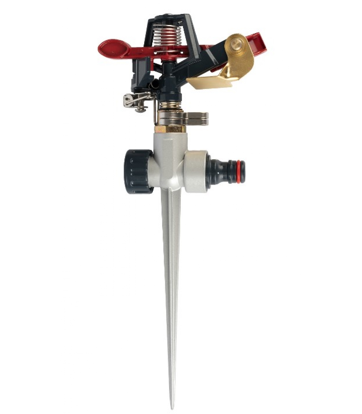 Металлический разбрызгиватель устанавливается в одной точке и используется для кругового полива отведенной площади участка.