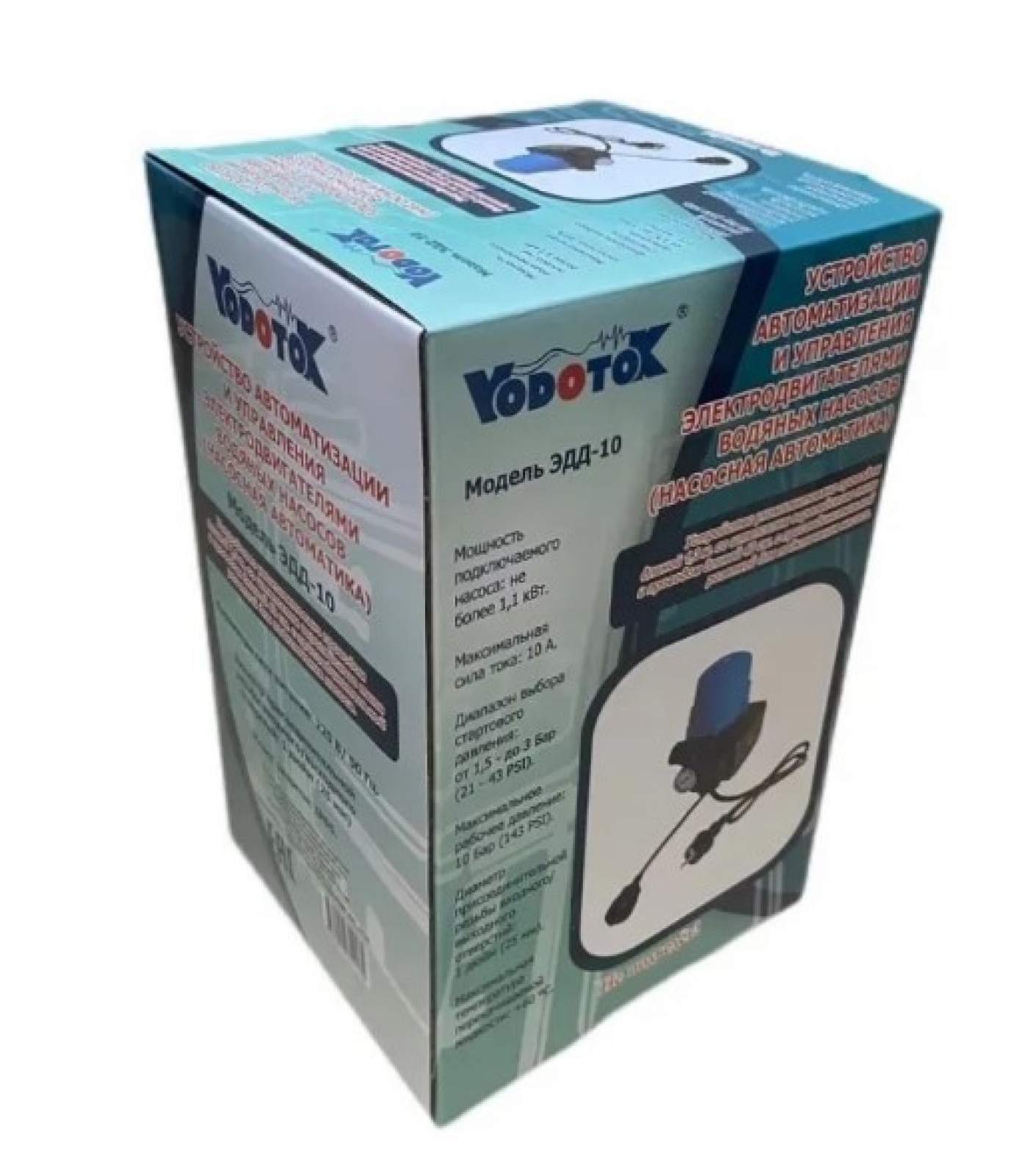 Автоматика «Vodotok» ЭДД 10 предназначена для автоматизации и оптимизации работы насоса. Также автоматику применяют для защиты насосного оборудования от повреждений, вызванных работой без воды (защита от «сухого хода»).