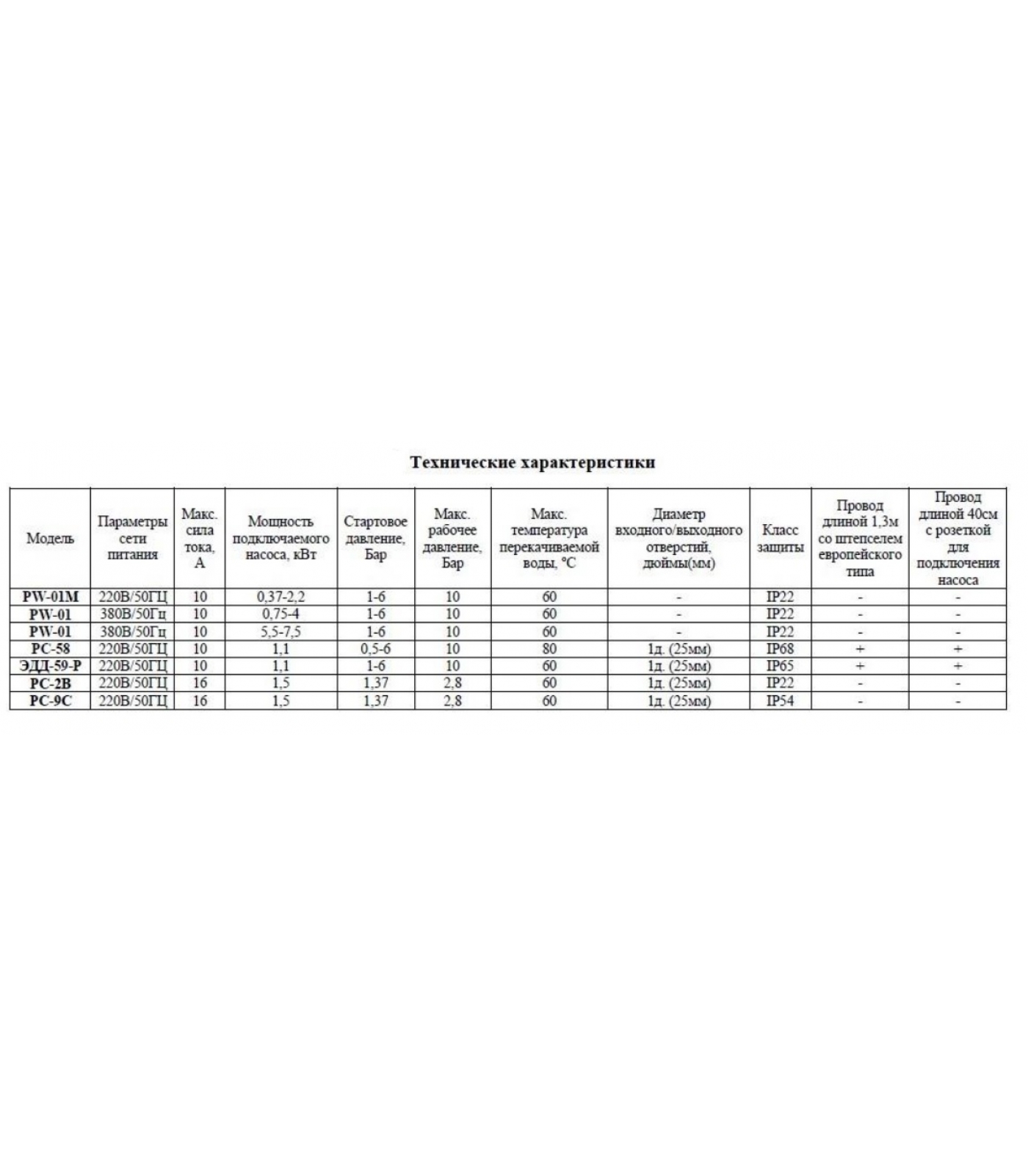 Данные устройства предназначены для автоматизации и оптимизации работы насосов и насосных станций. Они автоматически включают насос при снижении давления в системе водоснабжения (при открытии крана, начале работы системы полива и т.д.) и выключают при прекращении водопотребления (при закрытии крана, окончании работы системы полива и т.д.).Кроме этого данные устройства предназначены для защиты насоса от повреждений, вызванных работой без воды (защита от сухого хода), а также автоматически отключают питание насоса при появлении сбоев в подаче воды или работе насоса.Характеристики