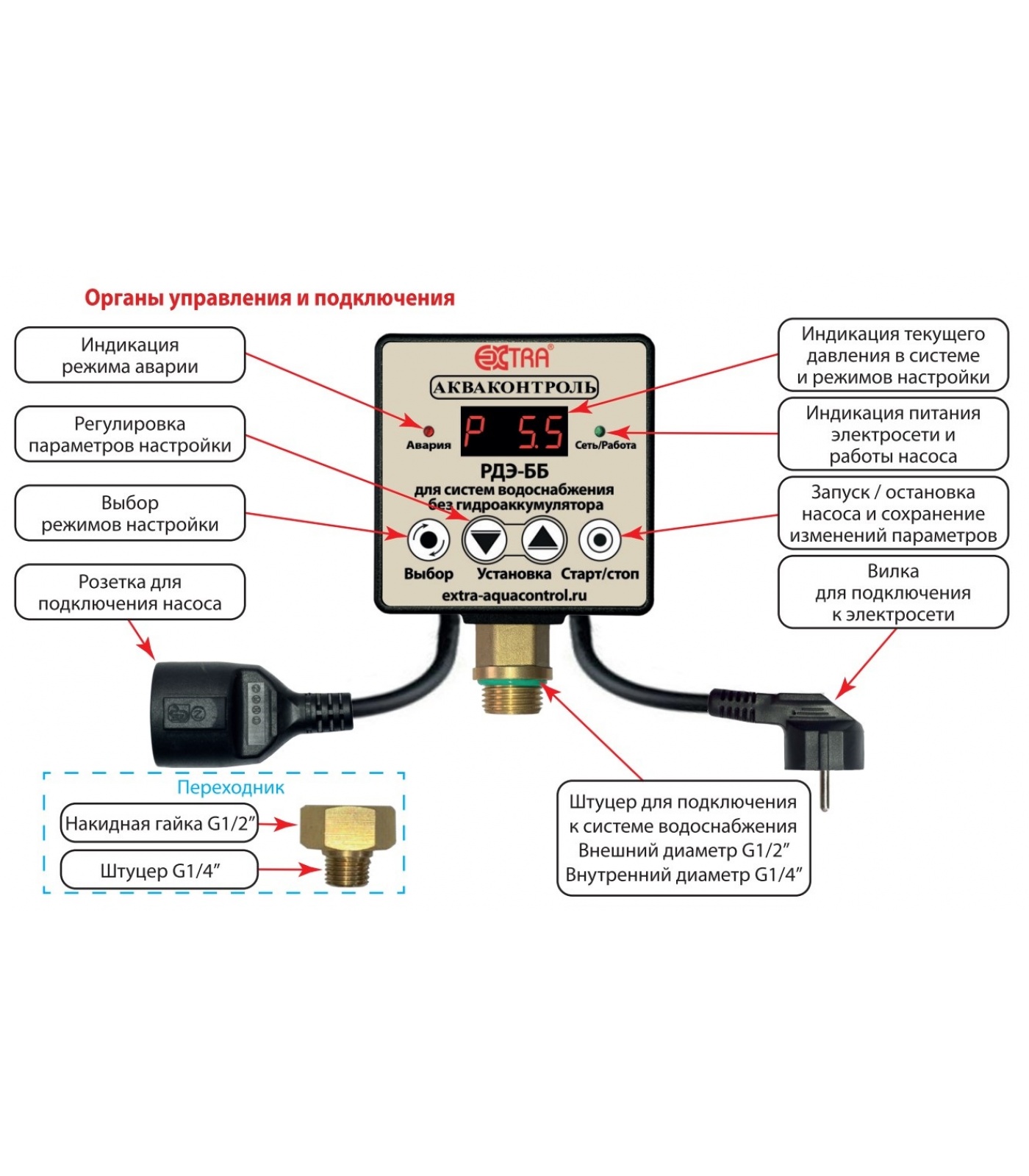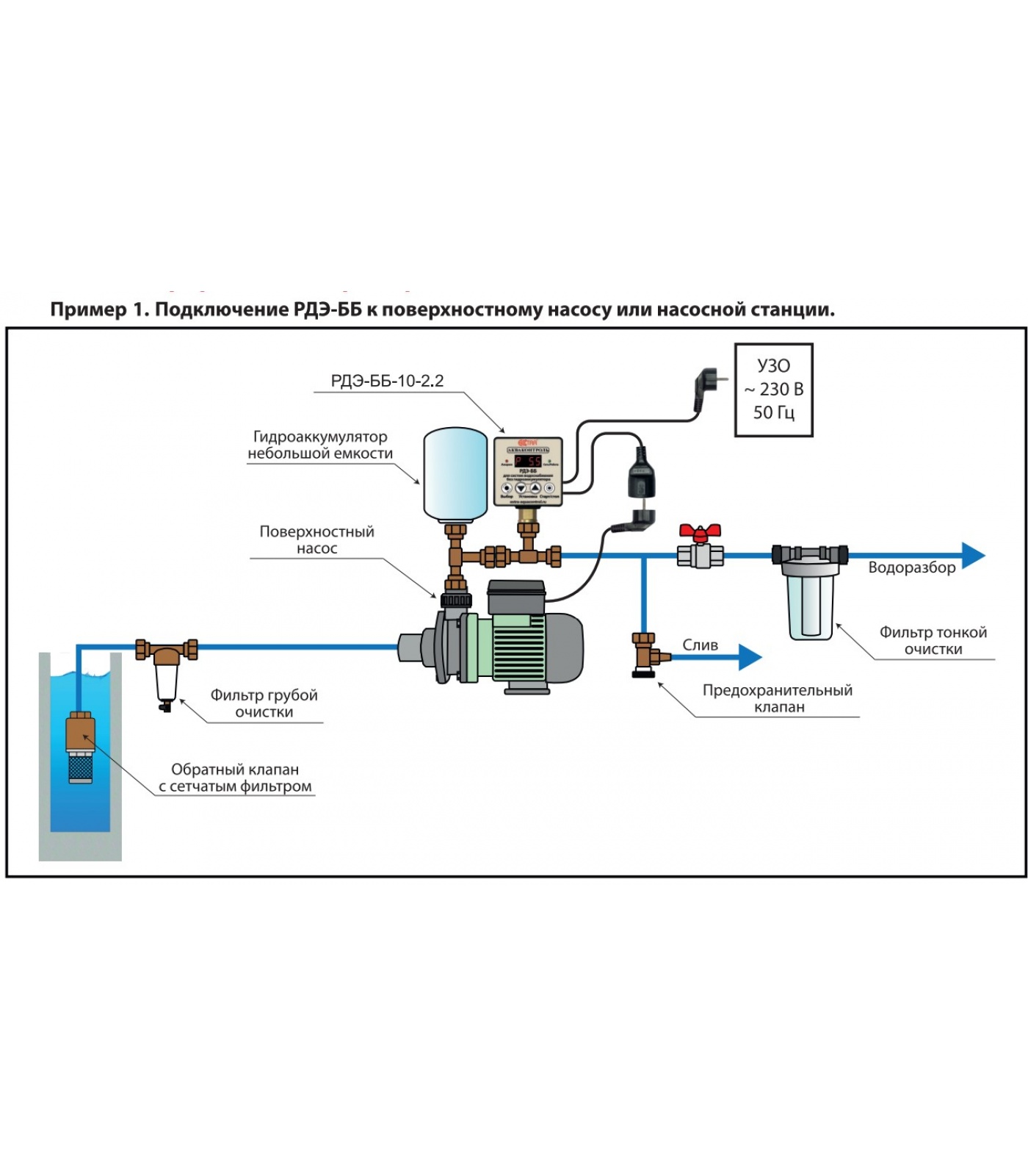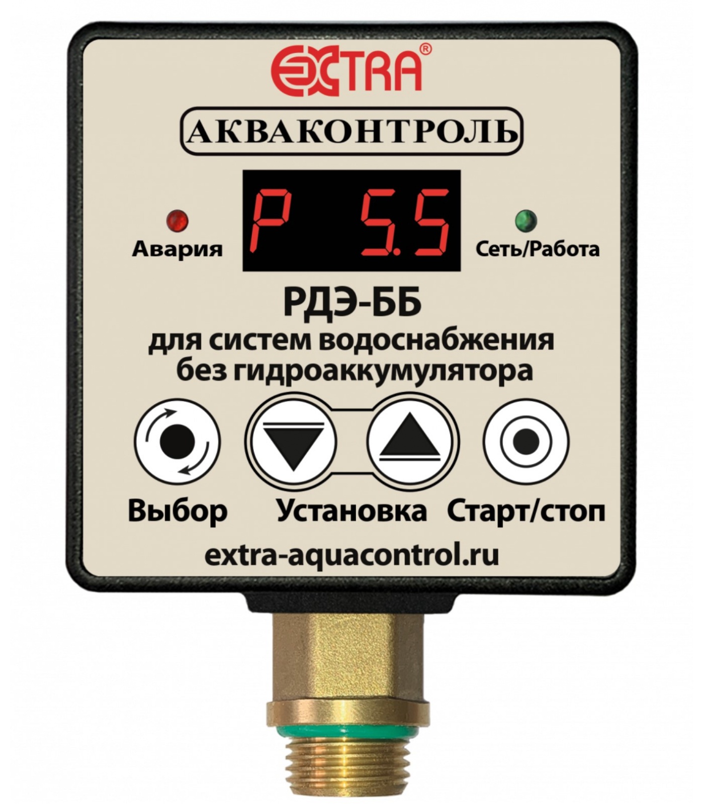 Реле давления воды с плавным пуском для систем водоснабжения без гидроаккумулятора "EXTRA Акваконтроль" РДЭ-ББ-10-2.2 предназначено для автоматизации работы бытовогопогружного электронасоса в системах водоснабжения без гидроаккумулятора или поверхностного насоса совместно с гидроаккумулятором небольшой емкости потребляемой мощностью Р1 не более 2.2 кВт.