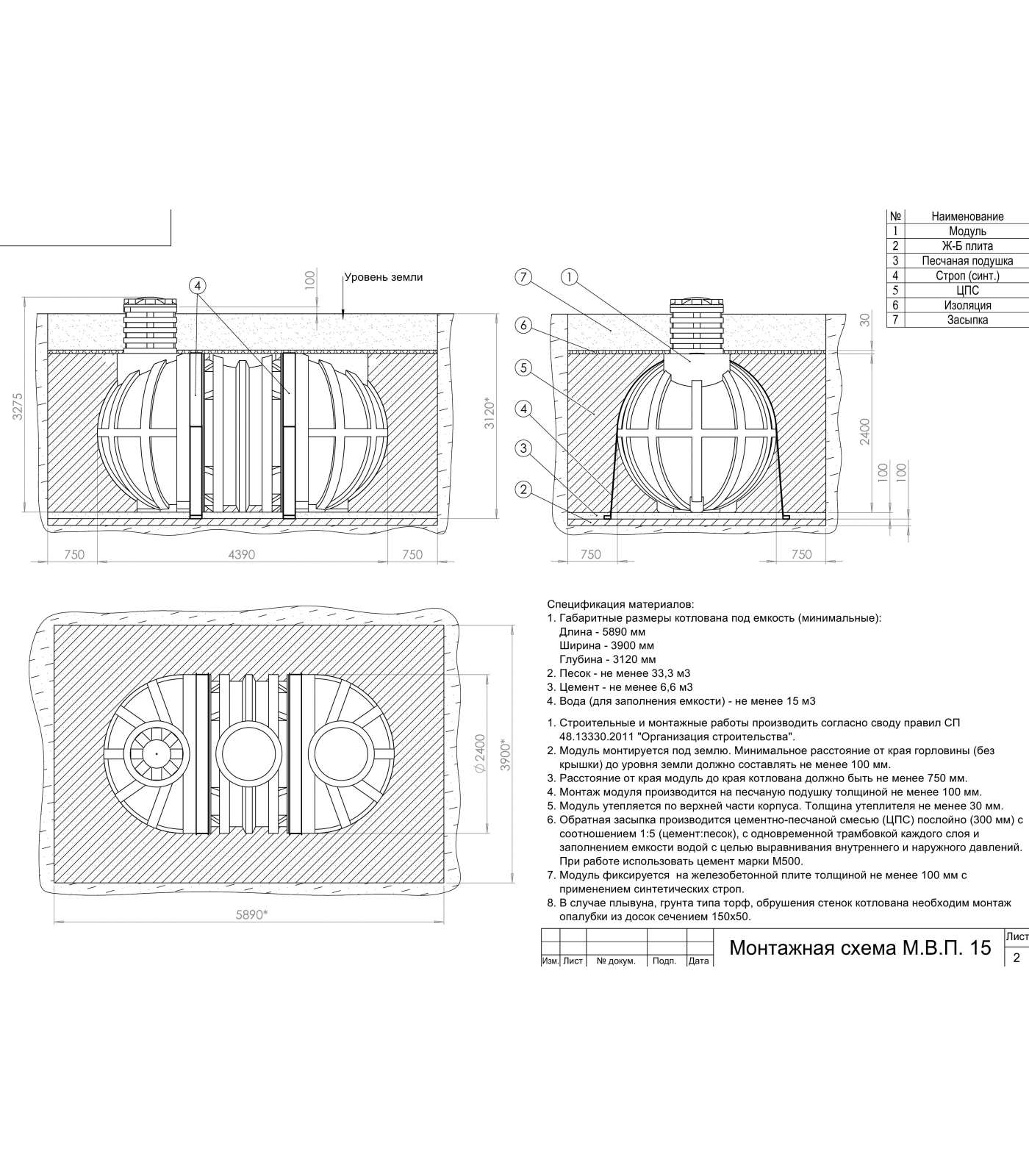 Подземные резервуары предназначены для хранения питьевой воды и прочих жидкостей, выполнены из LLDPE, который не вступает в реакцию с жидкостями и является химически нейтральным материалом. Объем данного резервуара составляет 15 000 литров (15 куб.м). Все резервуары обладают модульной конструкцией, которая позволяет изготавливать емкости до 50 000 литров. Резервуар поставляется клиенту в уже собранном виде.