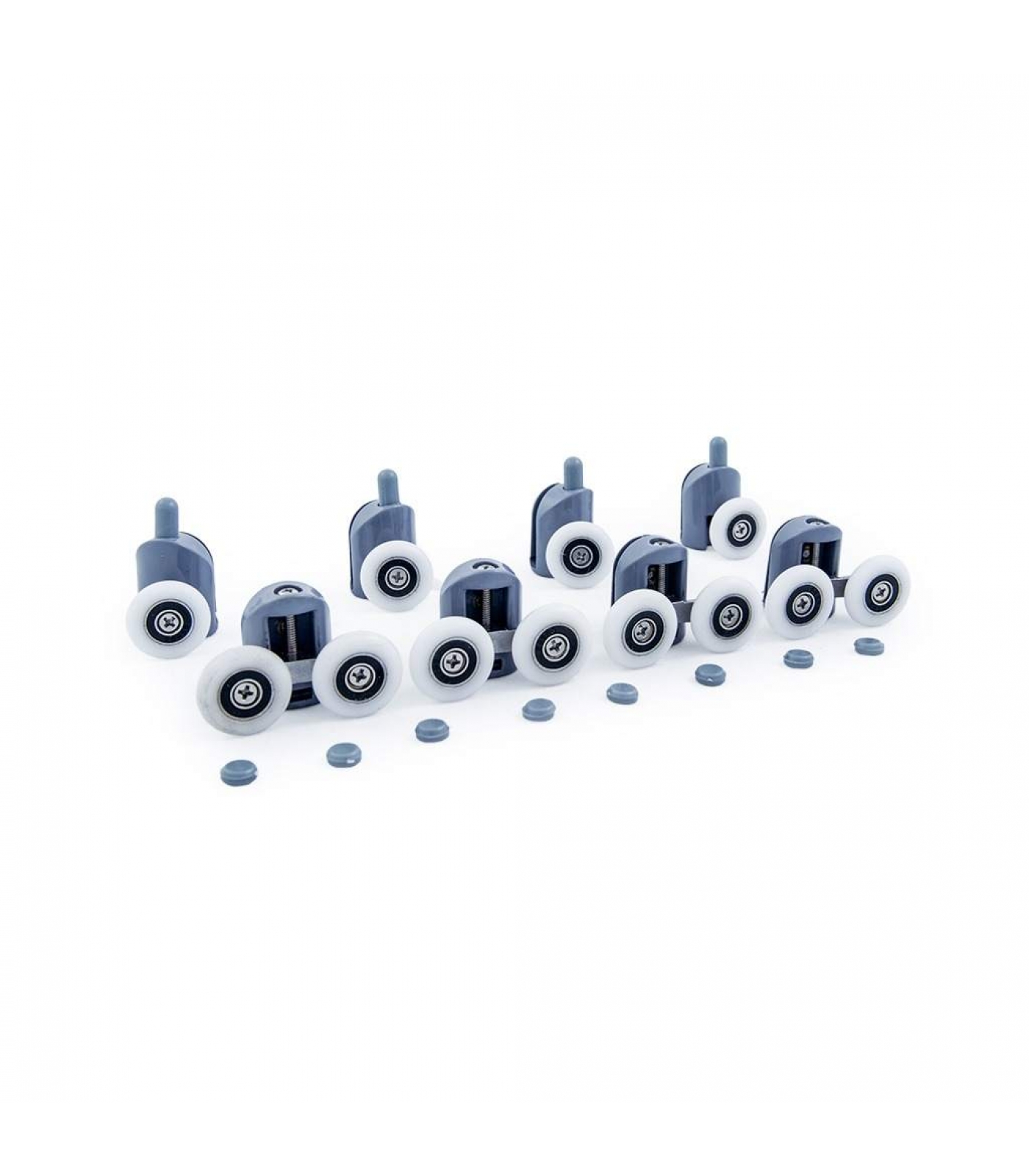 Смешанный набор роликов для душевой кабины DC 1001: одинарные и двойные ролики со съемными колесами, диаметр колесика — 23 мм. В наборе — 8 штук: 4 верхних ролика, 4 нижних. Ролики оснащены кнопочным креплением под 1 отверстие, диаметр монтажного отверстия — от 10 до 12 мм. Подходят для стекол толщиной до 6 мм. В верхних роликах есть регулировочный винт для настройки, нижние ролики оснащены прижимной клипсой.