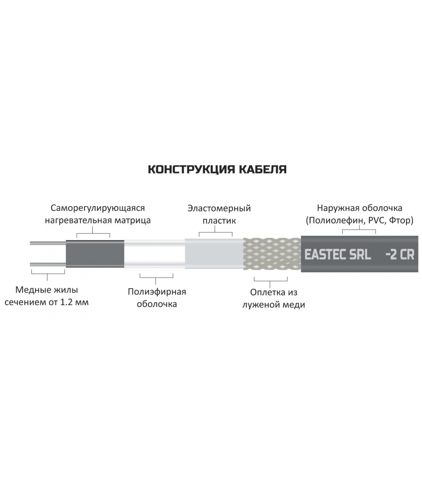 Саморегулирующийся греющий кабель Eastec SRL 2 CR экранированный с оплеткой из луженой меди, применяется для обогрева трубопроводов, водяных насосов, резервуаров, водосточных систем, кровель, теплиц.