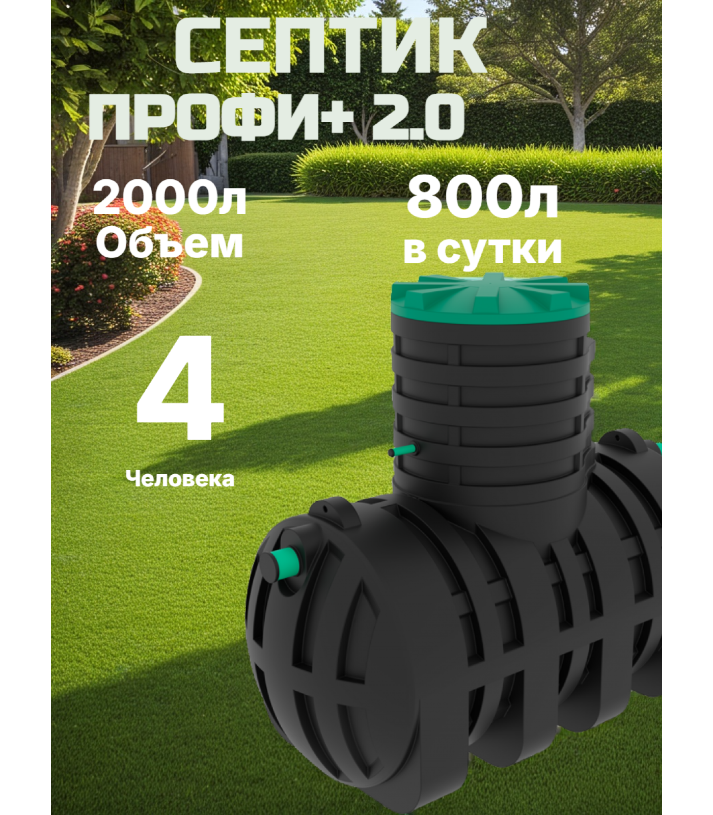 Септик Профи+ 2.0 имеет общий объем 2 000 литров, и производительность 800 литров в сутки, которой хватит на семью из 4х человек. Септики профи+ в комплектации S - энергонезависимые, что делает их идеальным решением если в регионе проживания отсутствует стабильной электроэнергии. Септик профи+ 2.0 устанавливается только если на участке отсутствуют высокие грунтовые воды, если же у вас именно такой, то стоит присмотреться к Термит Трансформер 1.5 PR или Профи+ 2.0 PR, которые созданы, как идеальное решение для районов с высоким УГВ.