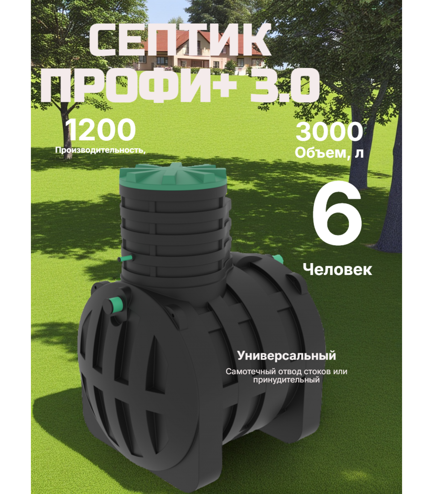 Септик Профи+ 3.0 имеет общий объем 3 000 литров, и производительность 1200 литров в сутки, которой хватит на семью из 6х человек. Септики профи+ в комплектации S - энергонезависимые, что делает их идеальным решением если в регионе проживания отсутствует стабильной электроэнергии. Септик профи+ 2.5 устанавливается только если на участке отсутствуют высокие грунтовые воды, если же у вас именно такой, то стоит присмотреться к Термит Трансформер 3.0 PR или Профи+ 3.0 PR, которые созданы, как идеальное решение для районов с высоким УГВ.