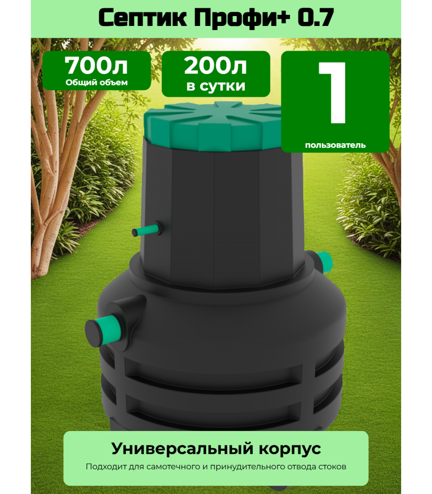 Септик Профи+ 0.7 имеет общий объем 700 литров, и производительность 200 литров в сутки, которой хватит на 1 человека. Септики профи+ в комплектации S - энергонезависимые, что делает их идеальным решением если в регионе проживания отсутствует стабильной электроэнергии. Септик профи+ 2.0 устанавливается только если на участке отсутствуют высокие грунтовые воды, если же у вас именно такой, то стоит присмотреться к Термит Трансформер 1.5 PR или Профи+ 2.0 PR, которые созданы, как идеальное решение для районов с высоким УГВ.