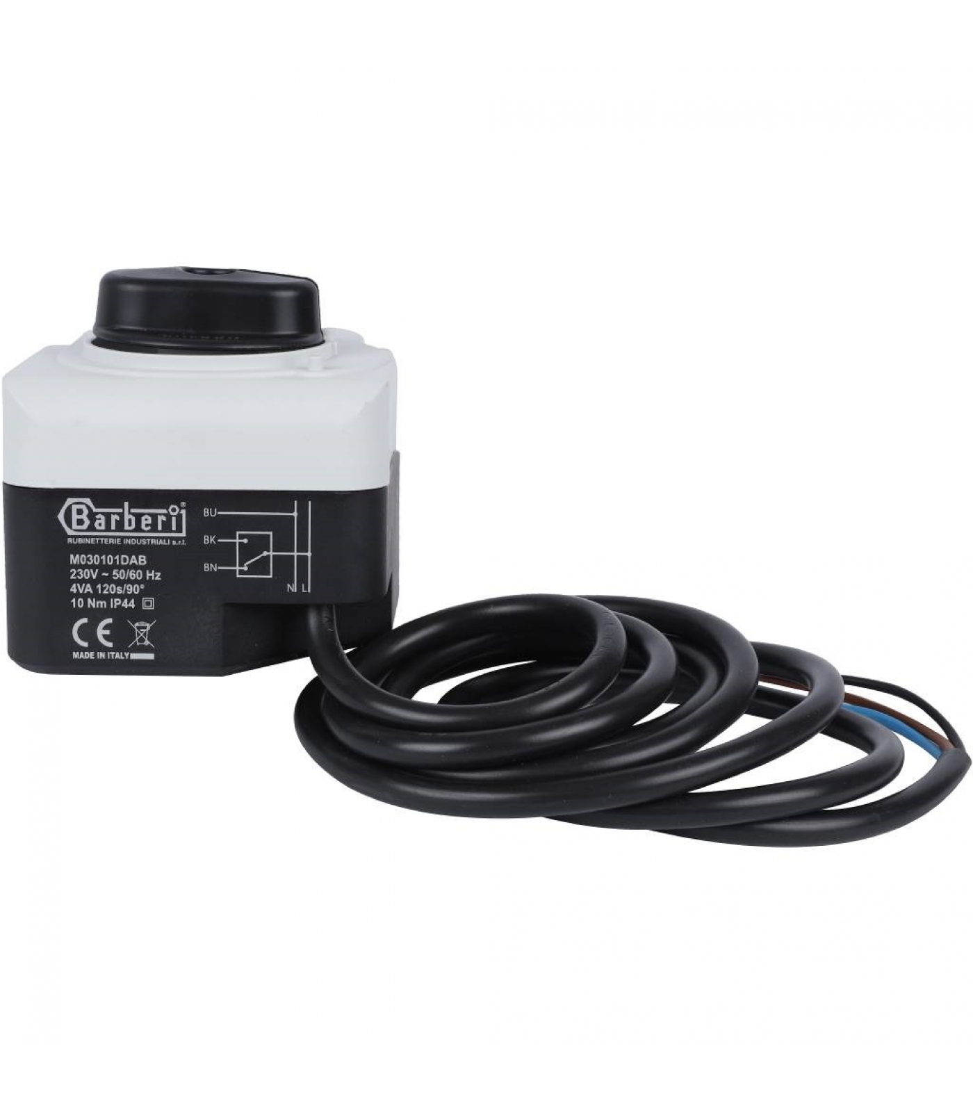 Управляющий сигнал – 3-х позиционный. Привод имеет медленный ход, поворачивая затвор клапана на 90deg; за 120 секунд, что исключает гидравлические удары в трубопроводной сети. Сервопривод может устанавливаться в любом положении, кроме нижнего расположения (под клапаном). Он надевается на шток клапана вместо рукоятки ручного управления. Электропитания привода осуществляется от сети с напряжением 230 В.