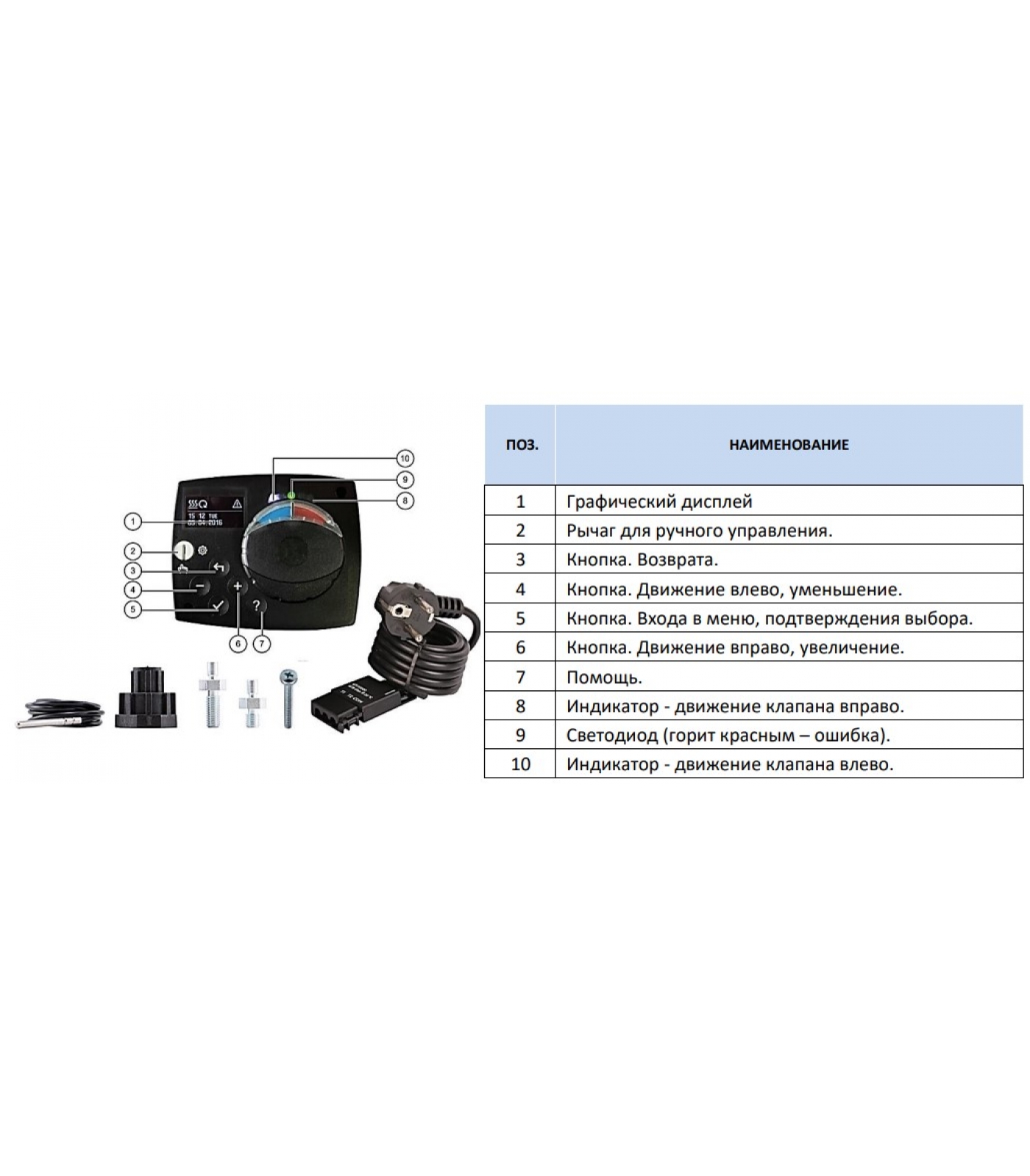 Электропривод укомплектован погружным температурным датчиком, монтажной втулкой-адаптером для установки привода на клапан, стопорными болтами для исключения вращения привода вокруг клапана, фиксирующим винтом для закрепления привода на штоке клапана, питающим кабелем.