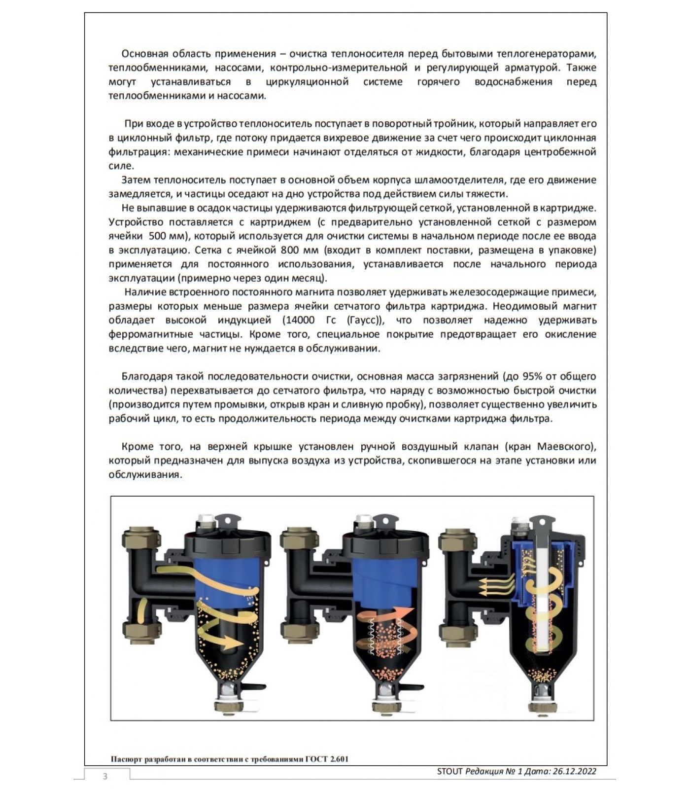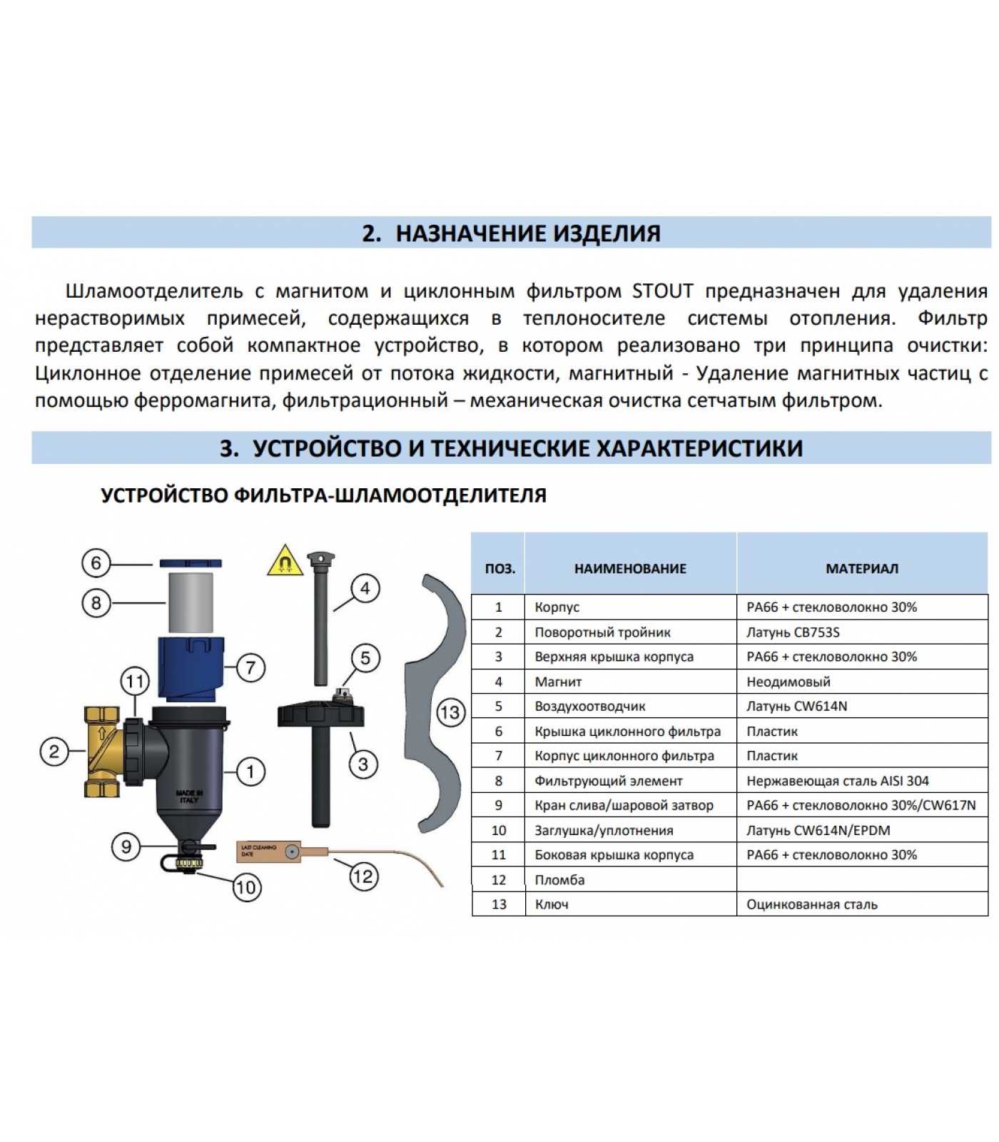 Шламоотделитель с магнитом и циклонным фильтром STOUT предназначен для удаления нерастворимых примесей, содержащихся в теплоносителе системы отопления.