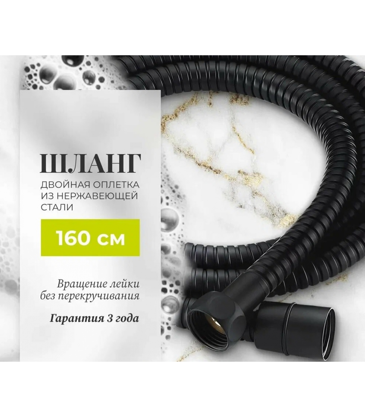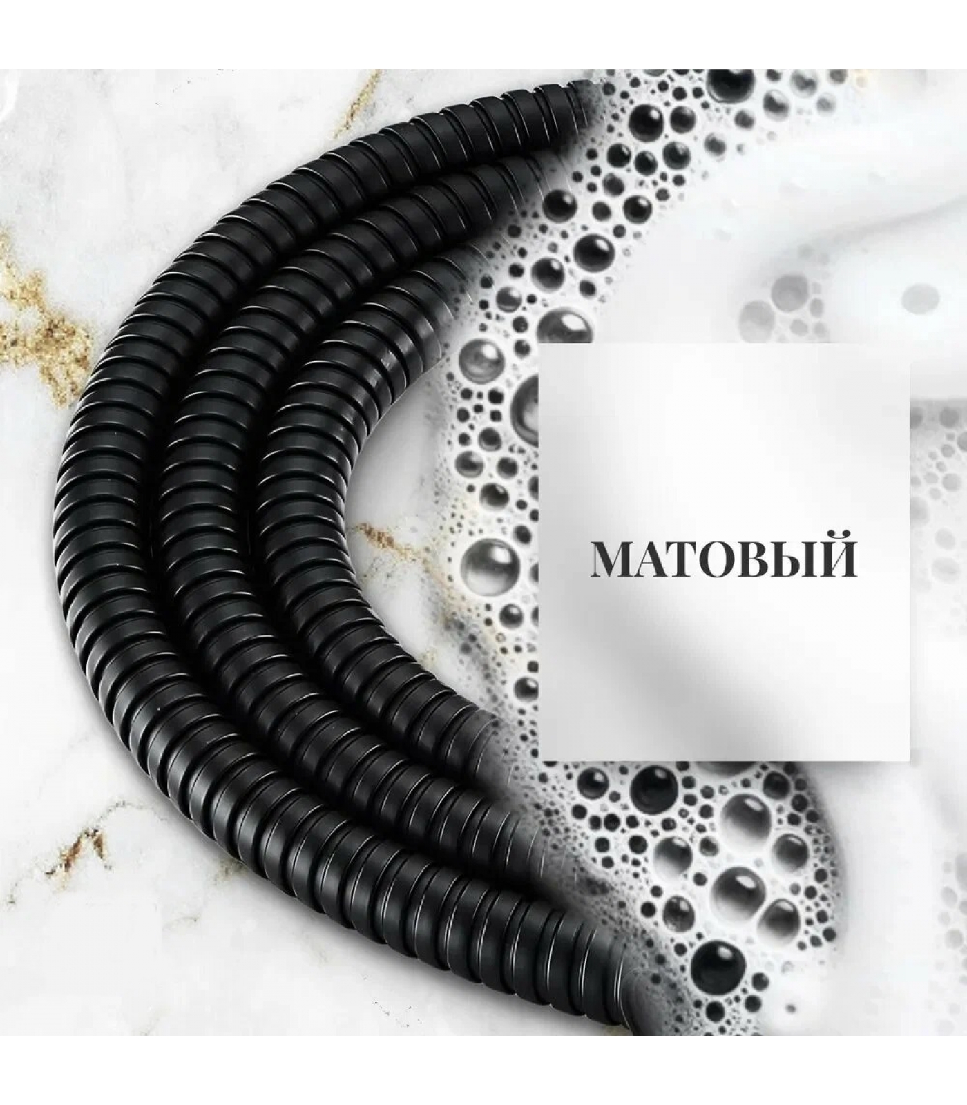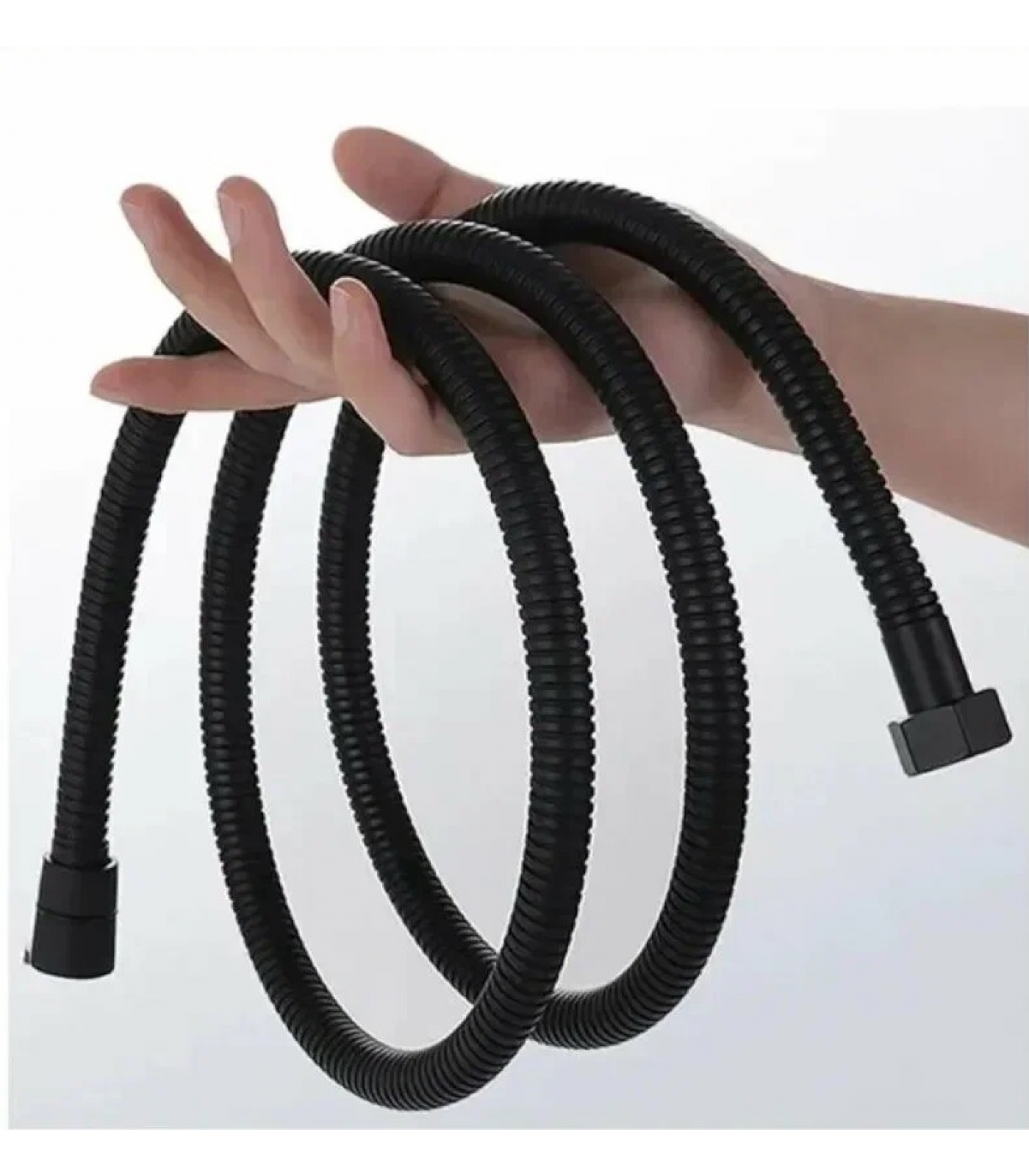 Шланг изготовлен из высокопрочного металла с покрытием черного цвета. Такое покрытие надолго сохраняет первоначальный вид изделия, не стирается и не тускнеет на протяжении всего срока службы.
