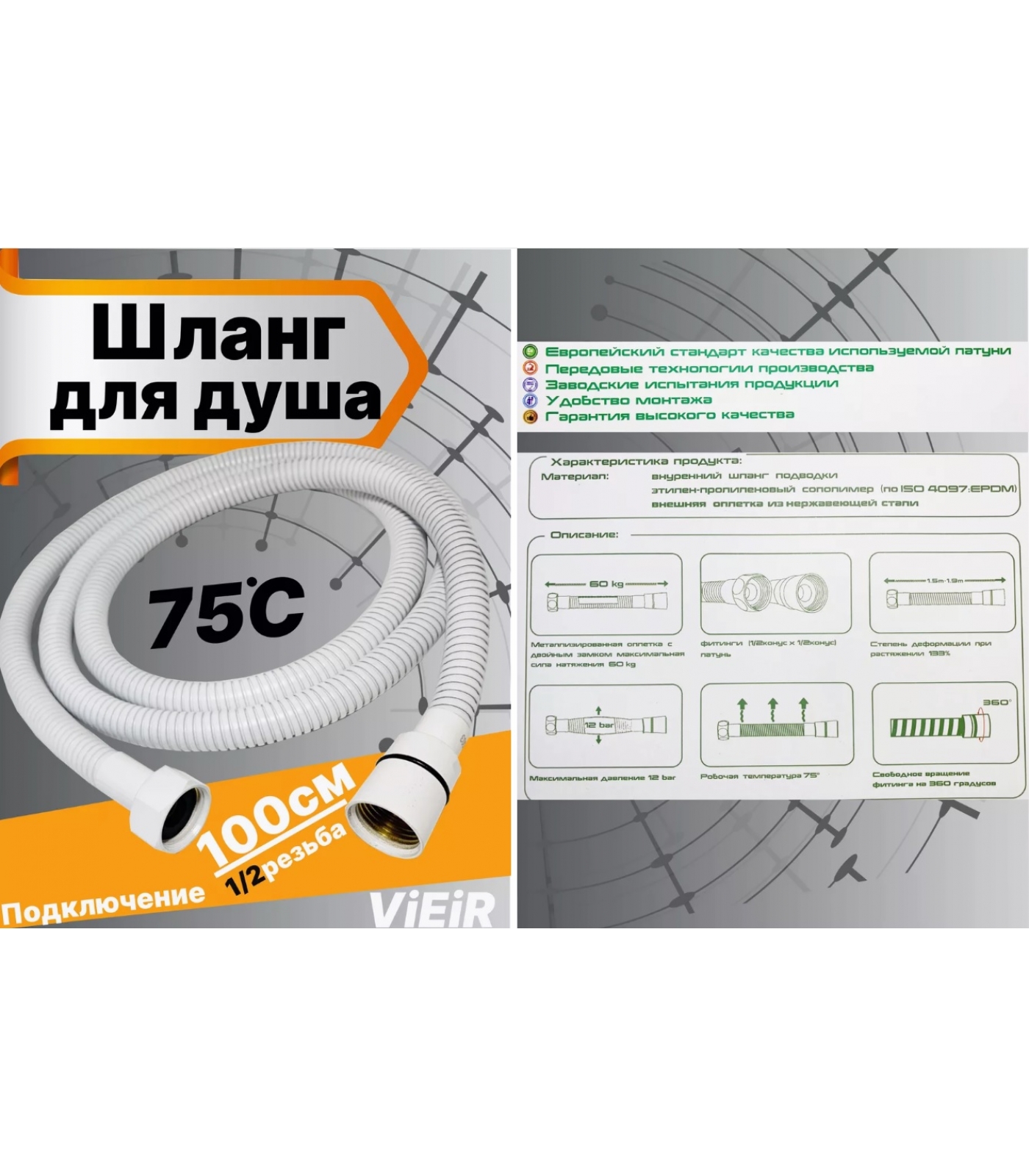 Шланг для душа VIEIR VR60100F, 100 см, белый матовый подходит для любых типов душевых систем и смесителей, а также может использоваться в качестве удлинителя для других устройств.