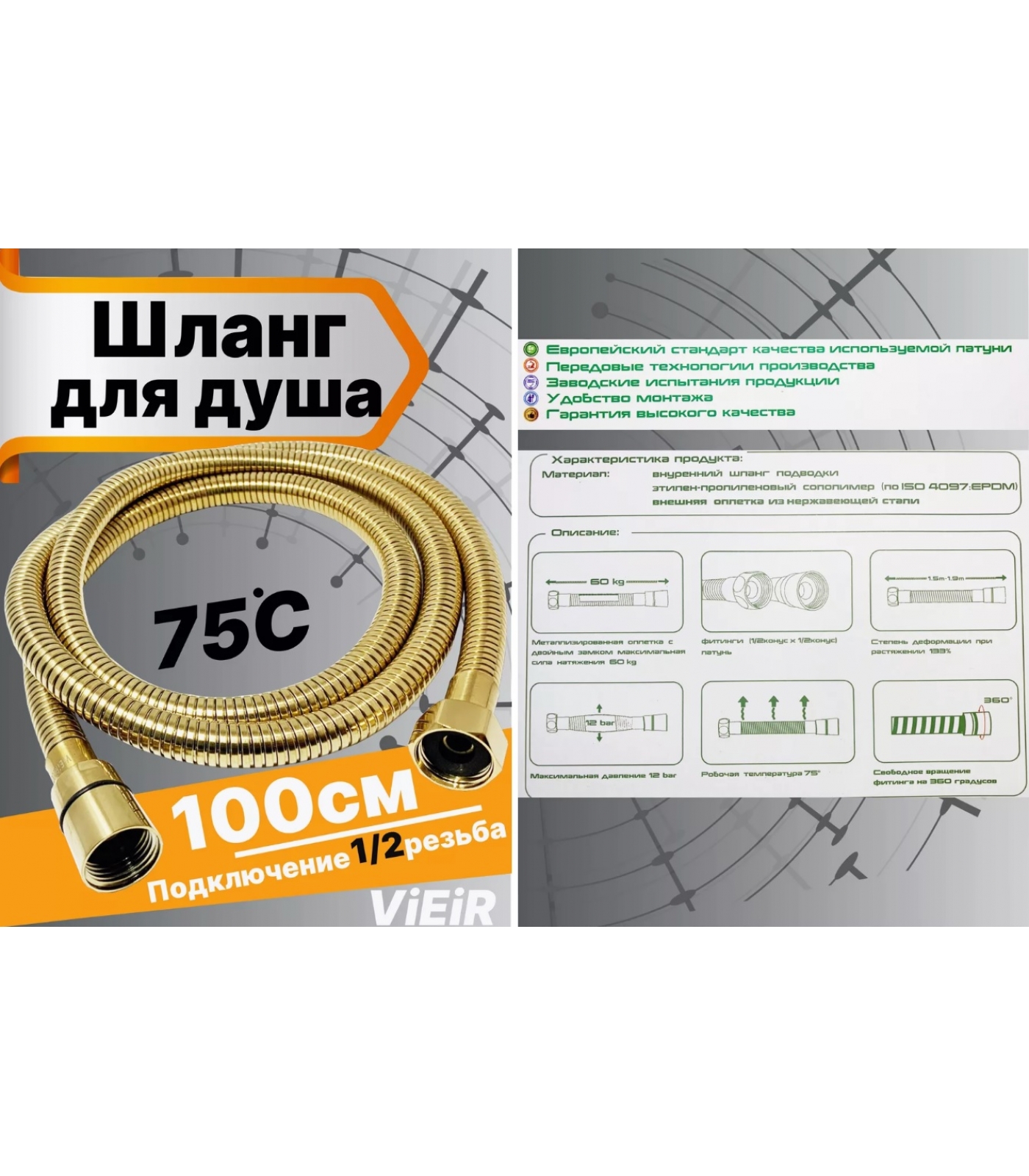 Шланг для душа VIEIR VR60100S, 100 см, золотой матовый подходит для любых типов душевых систем и смесителей, а также может использоваться в качестве удлинителя для других устройств.