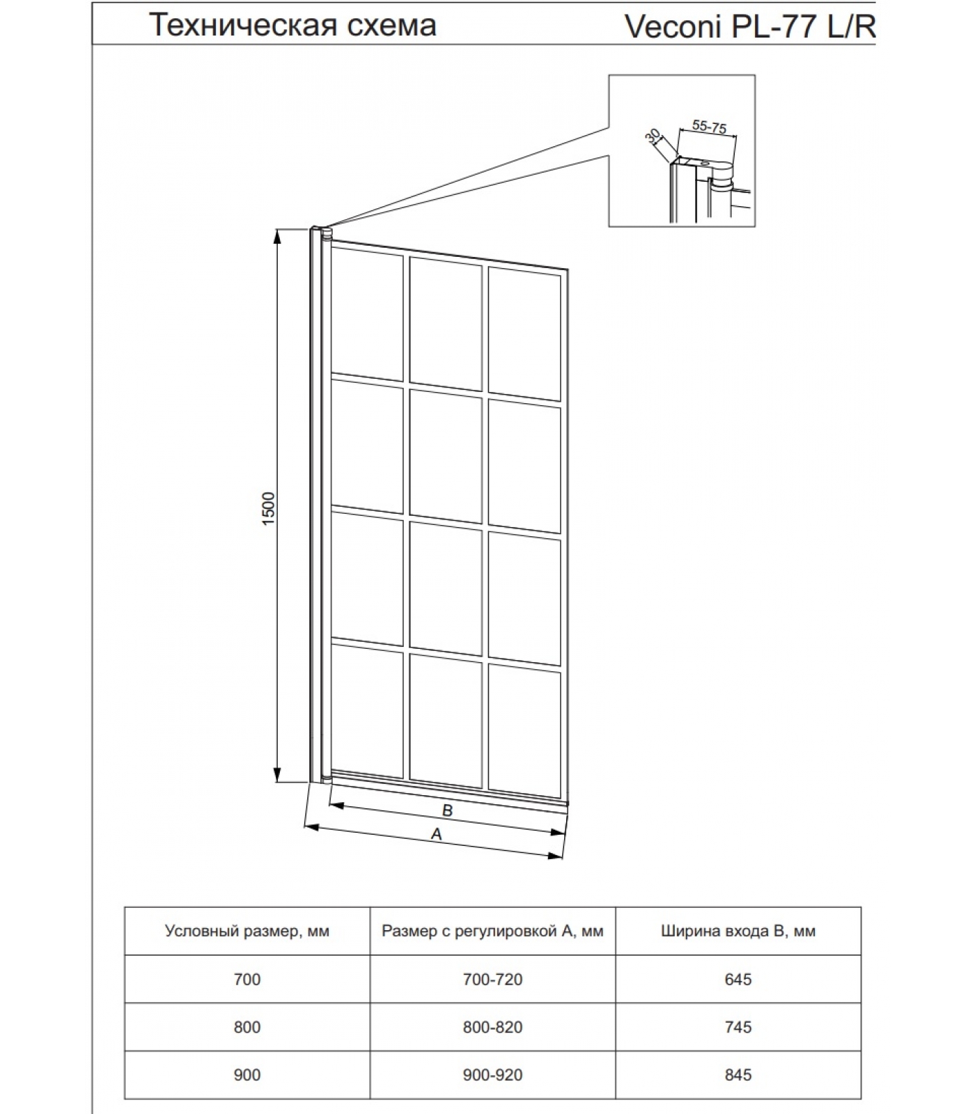 Шторка на ванну Veconi распашная левая с маятн.мех. 900x1500,черный,прозрач.принт клетка