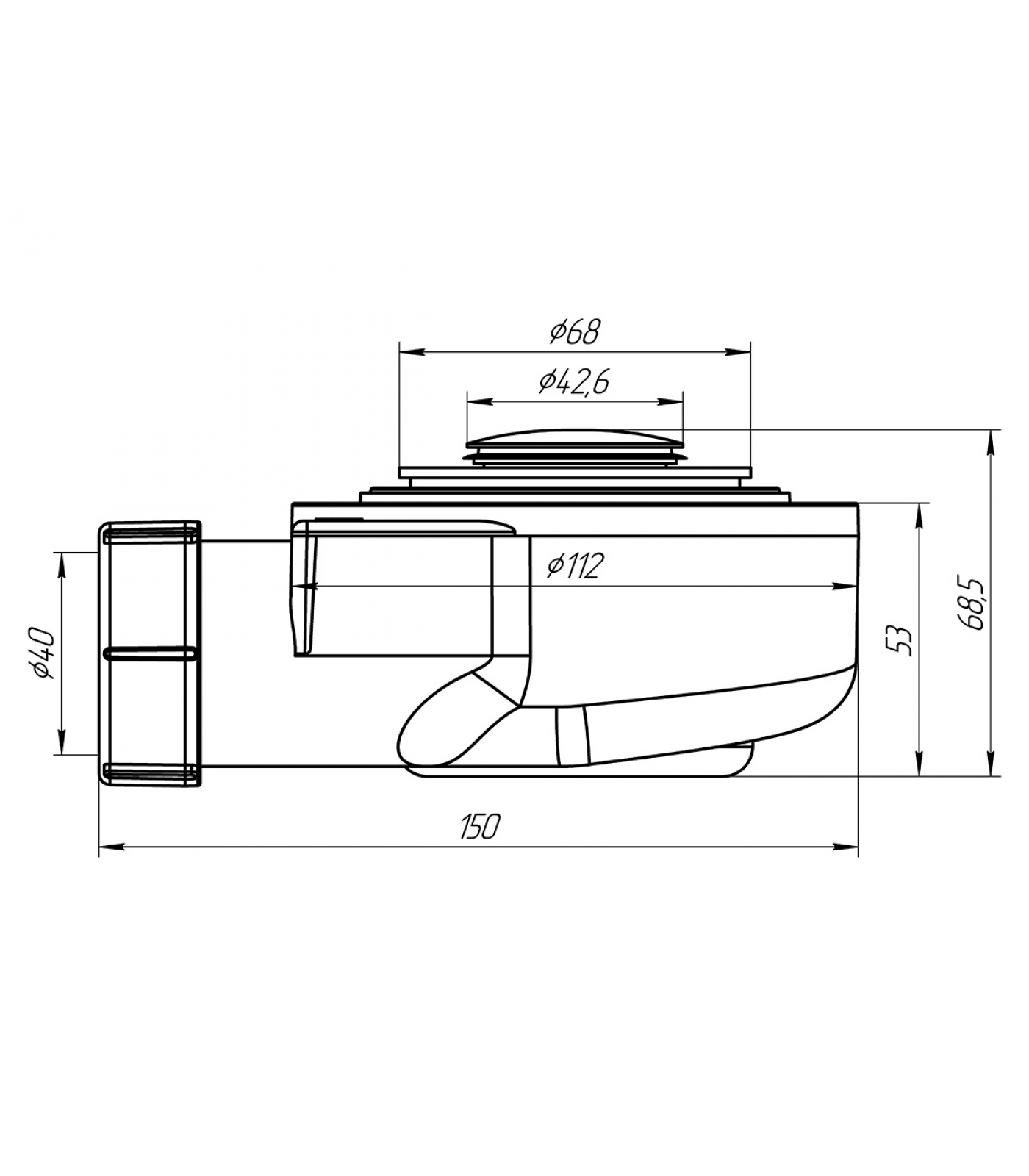 Сифон сливной АНИ пласт E450CL для душевого поддона с хромированной крышкой "клик-клак" имеет пропускную способность 0,53 л/сек и монтажную высоту 53 мм.