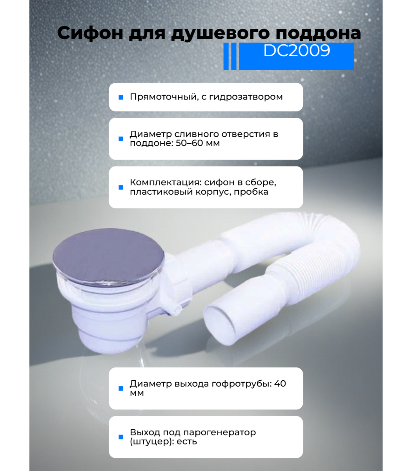Сифон для душевой кабины с низким поддоном DC 2009, d 50-60мм, гофра 40мм