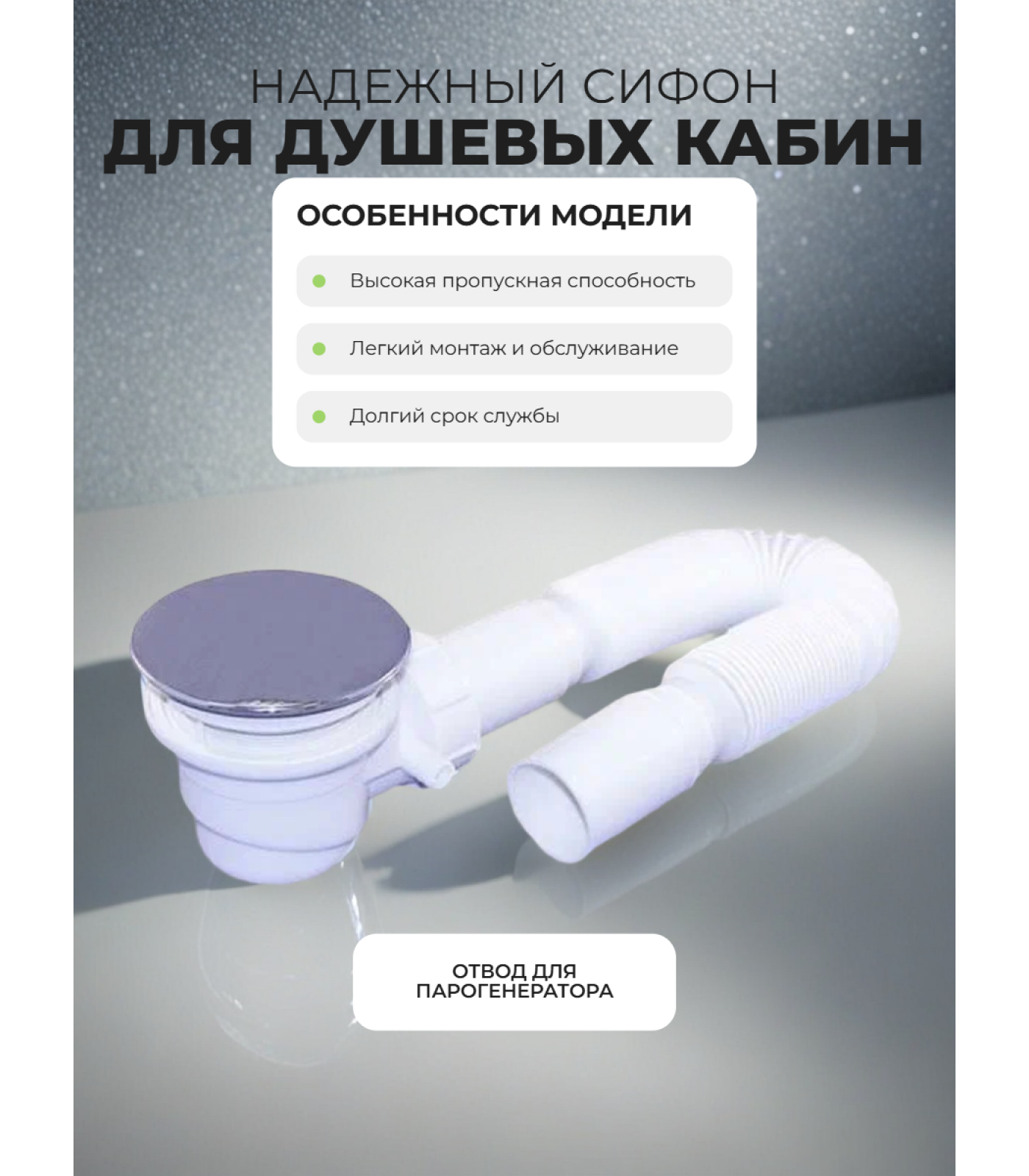 Оснащен выходом под парогенератор (штуцер). В комплект к сифону входит пластиковый фильтр — специальная сетка, которая улавливает волосы и крупный мусор. Такая сетка дополнительно защищает сифон от засора и облегчает чистку.