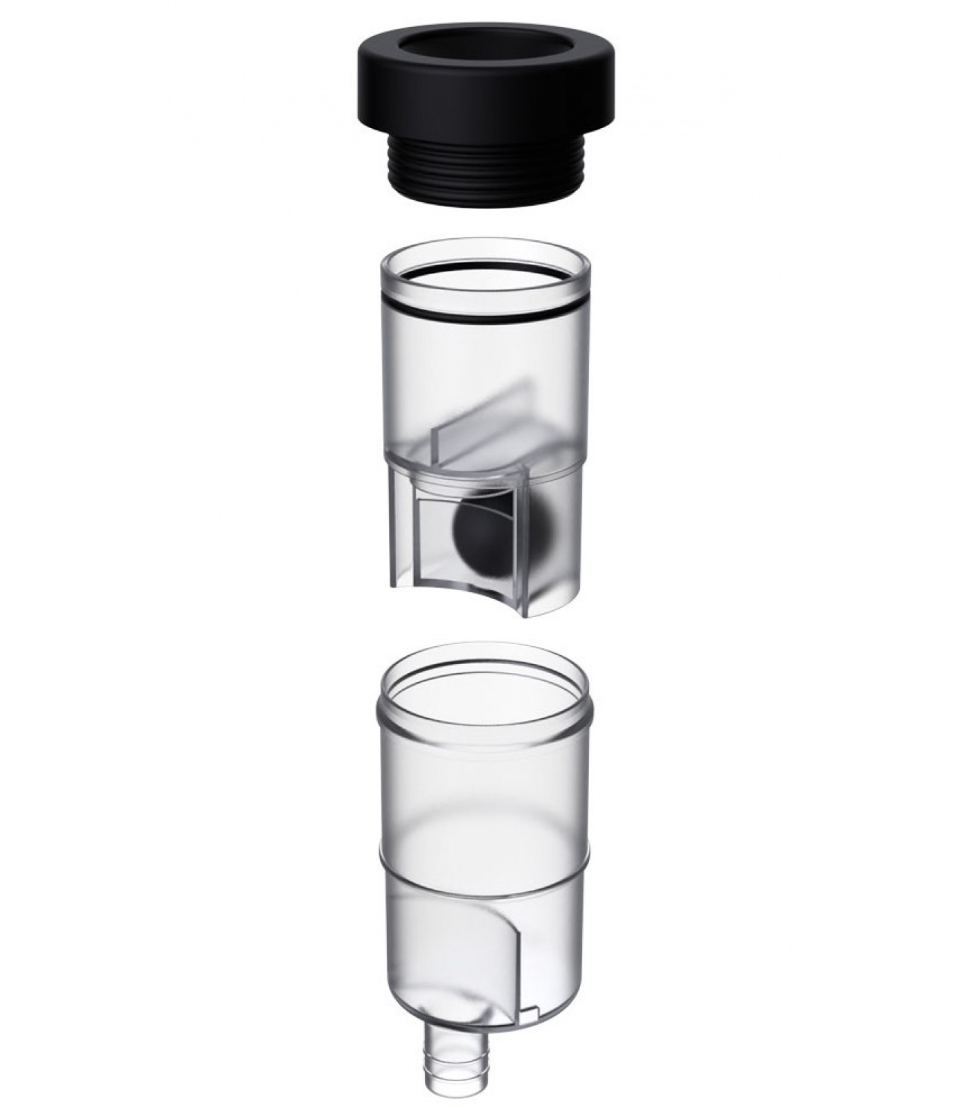 При пересыхании гидрозатвора срабатывает механический сухой затвор, выполненный в виде плавучего шарика, который опускается и перекрывает выходной патрубок.