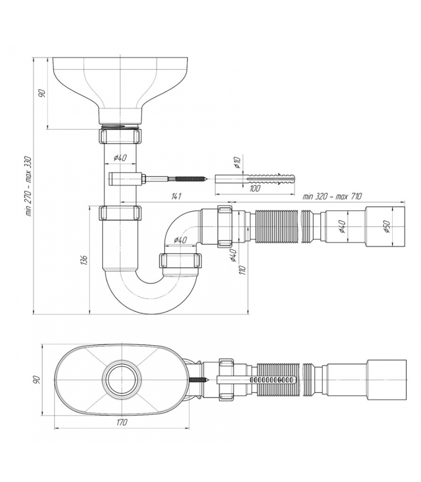 Комплектация: сифон, приемная воронка, гофротруба 40х50 мм