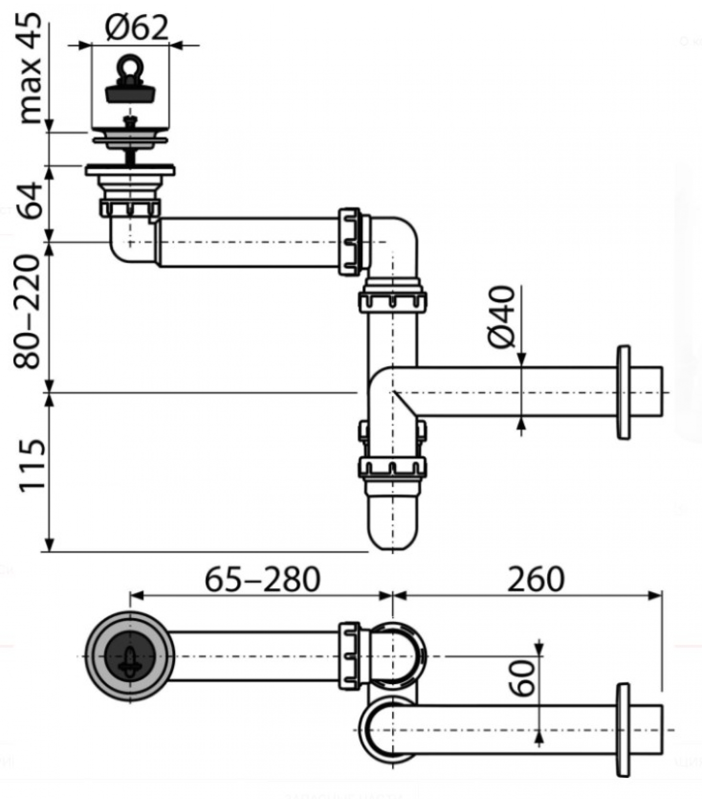 Сифон для умывальника 1 1/2*40 прямоточый смещенный