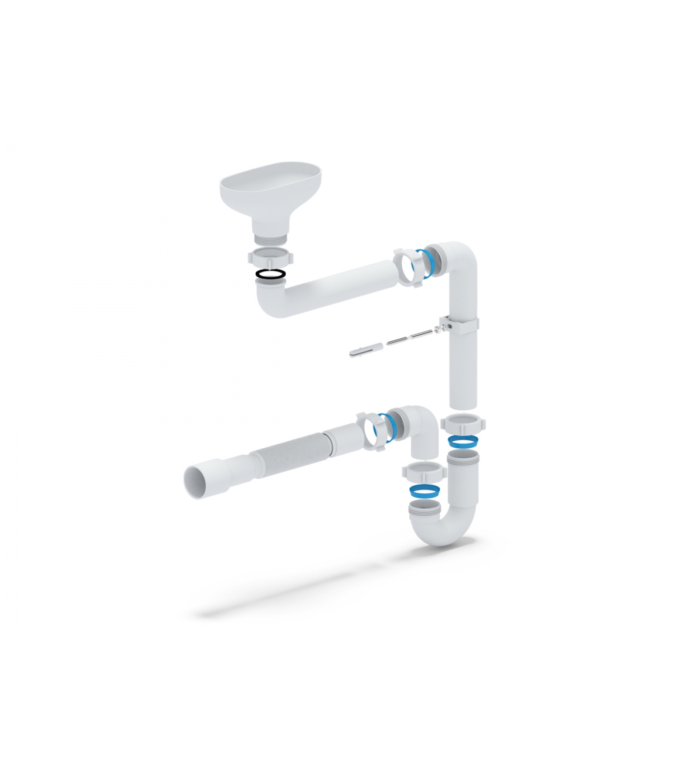 В стандартный комплект входят элементы: сетка или защитная решетка— обычно этот элемент имеет несколько, 5-6 отверстий, которые имеют размер диаметра 1 см. Эта сетка или решетка устанавливается в умывальник, этот элемент вы можете видеть в раковине утром во время утреннего или вечернего умывания и очищения зубов. Основа элемента может быть выполнена из металла или пластмассы; прокладки из резинового материала — толщина этих изделий обеспечивает предотвращение просачивания воды через них из умывальника вниз на пол. Для дорогих обычно используются прокладки белого цвета, а для дешевых черные.