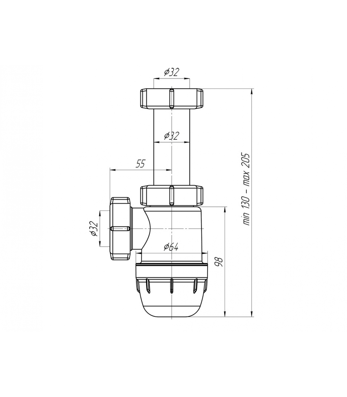 Сифон для умывальника бутылочного типа с уменьшенным корпусом. Без выпуска. Выход для подключения к канализации 32мм.