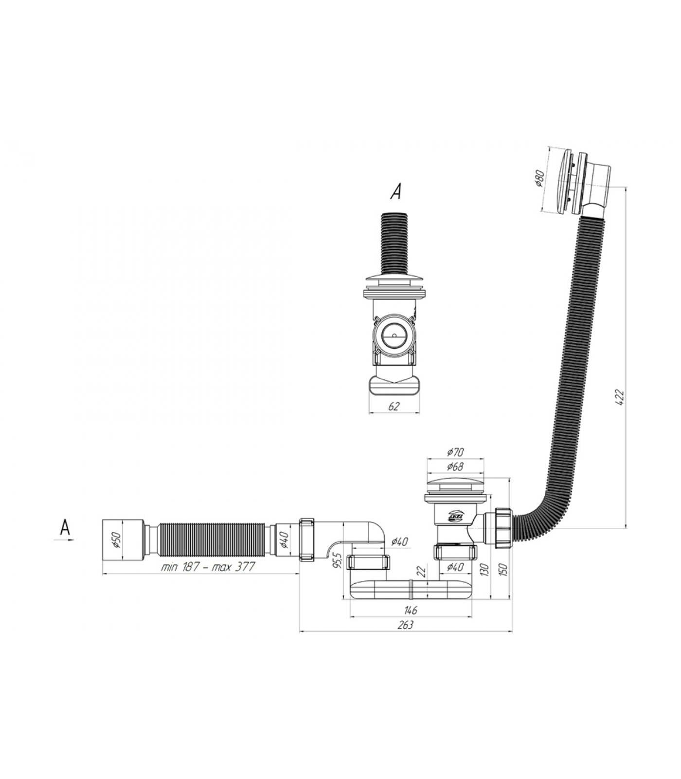 Сифон EC055GS для ванны Ани 1 1/2*40*50 с вып. Click-Clack (грибок-сетка) и переливом