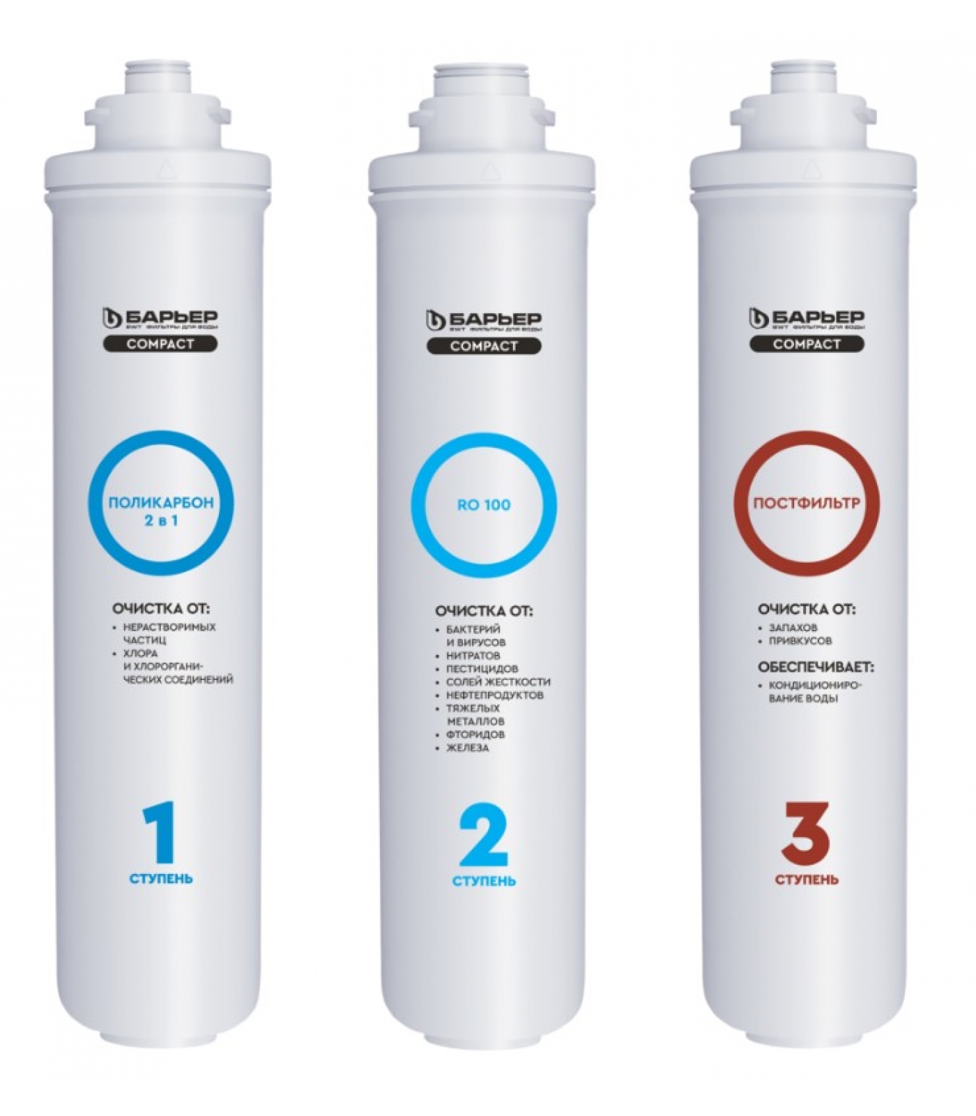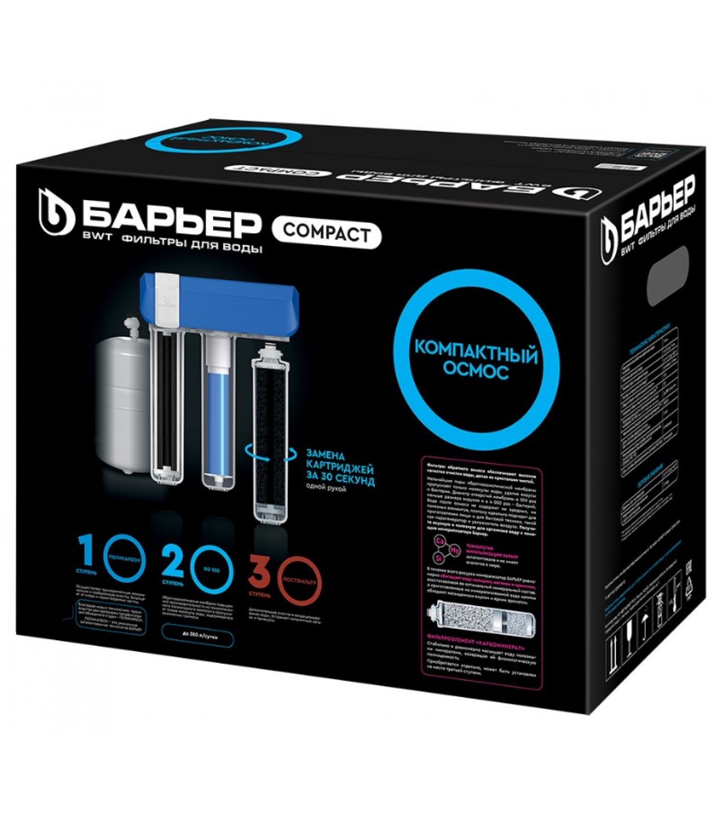 БАРЬЕР Compact OSMO 100 — первый трёхступенчатый обратный осмос , который по эффективности не уступает пятиступенчатому. В результате вы получаете кристально чистую воду, которая не уступает по качеству бутилированной. Система обратного осмоса — оптимальное решение не только для питья, но и для бытовой техники. Чайник, кофе-машина, утюг, увлажнитель будут работать дольше.
