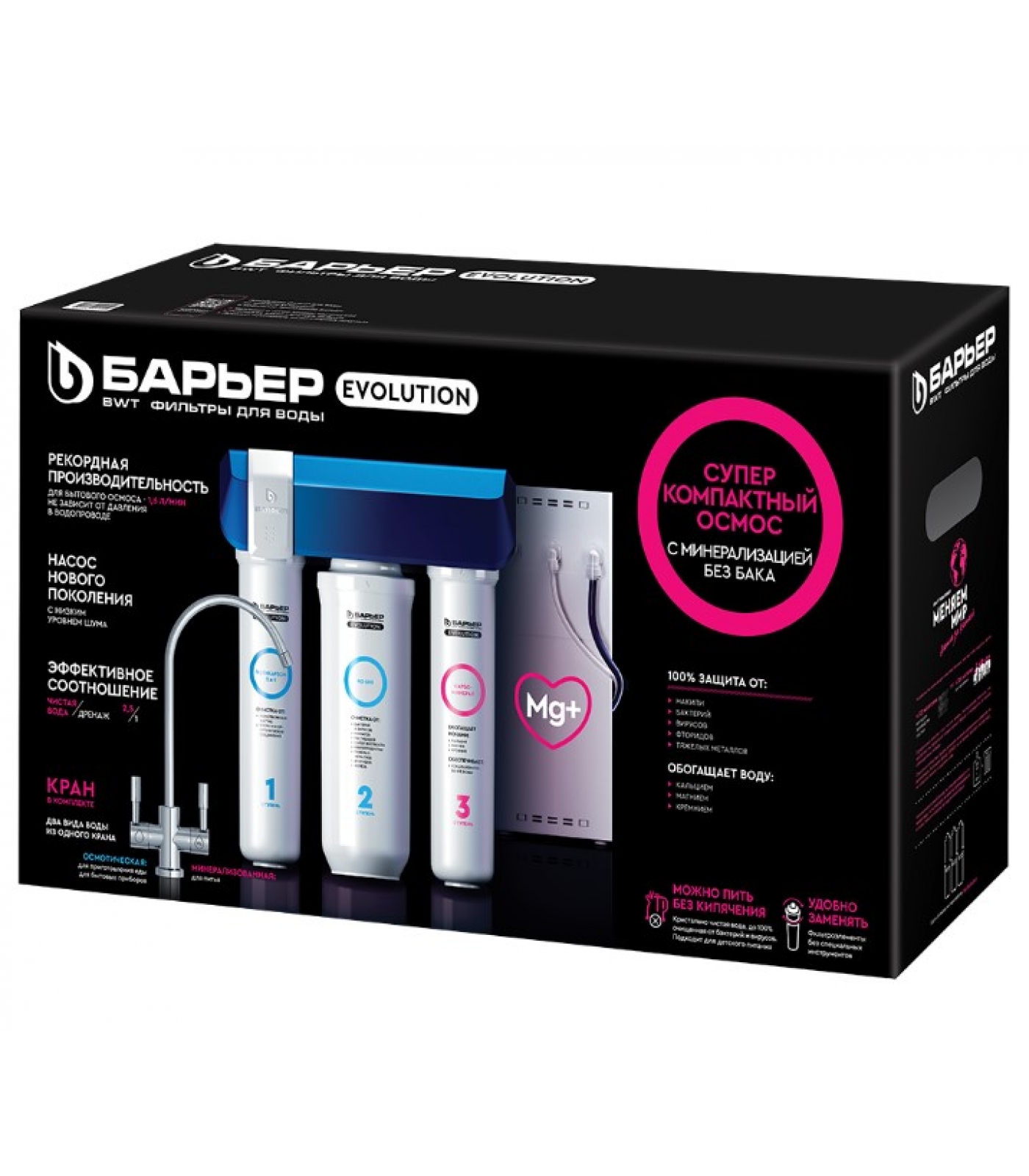 БАРЬЕР Evolution OSMO M — это суперкомпактный осмос, в котором собраны наши лучшие разработки и технологии. В комплекте специальный кран, который позволяет использовать сразу 2 типа воды: обратноосмотическую — для бытовой техники и минерализованную — для питья. Компактность - по размерам сопоставим с обычным проточным фильтром и помещается даже в самом ограниченном пространстве под мойкой. Рекордная производительность — 600 галлон или около 2270 л/сутки — превосходит большинство бытовых осмосов. Выгода — эффективное соотношение чистой воды и дренажа – 2,5:1. При 2,5 литрах очищенной воды 1 литр уходит в дренаж, у классических систем обратного осмоса соотношение чистой воды к дренажу – 1:4. Удобство — продуманная конструкция фильтра позволяет менять картриджи без специальных инструментов, ключей и навыков всего за несколько секунд.