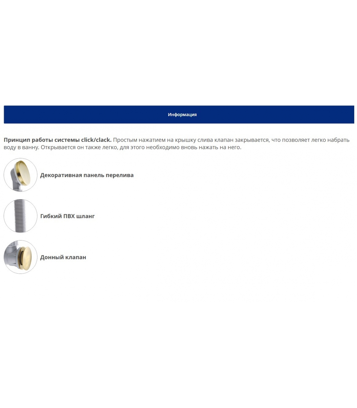 - В комплекте: донный клапан, гибкий ПВХ шланг, декоративная панель перелива